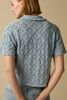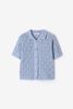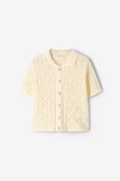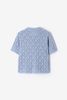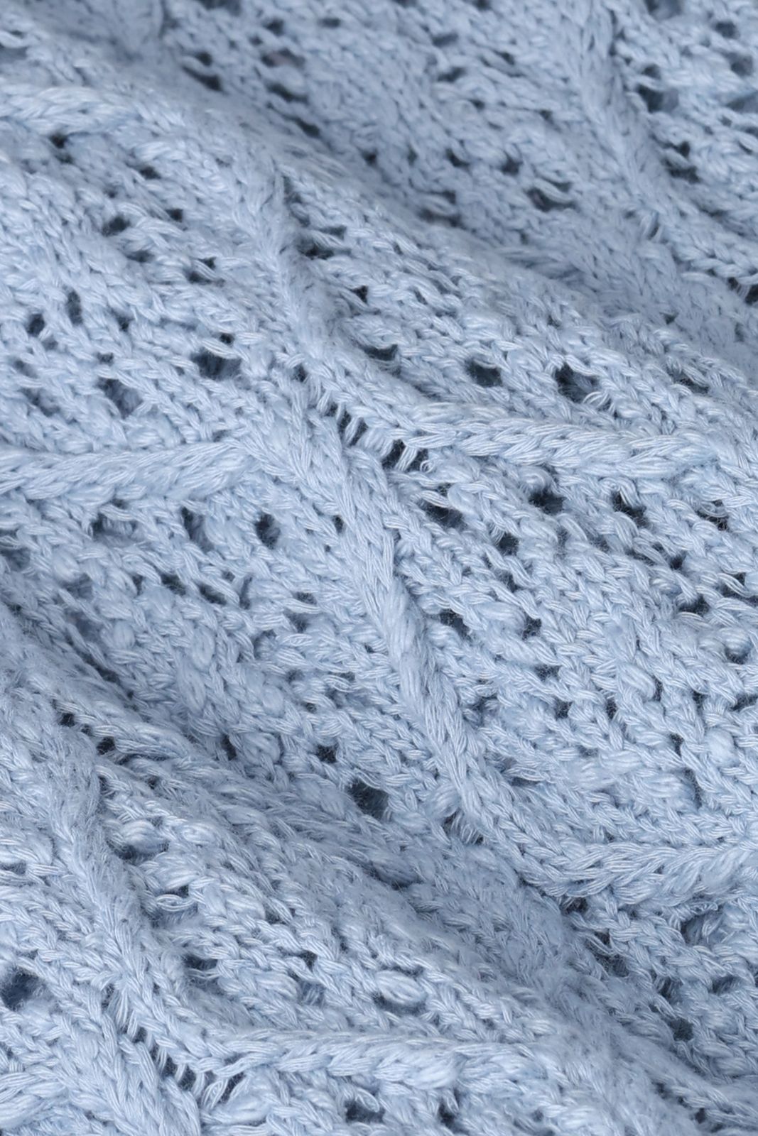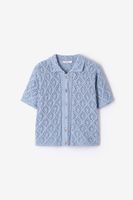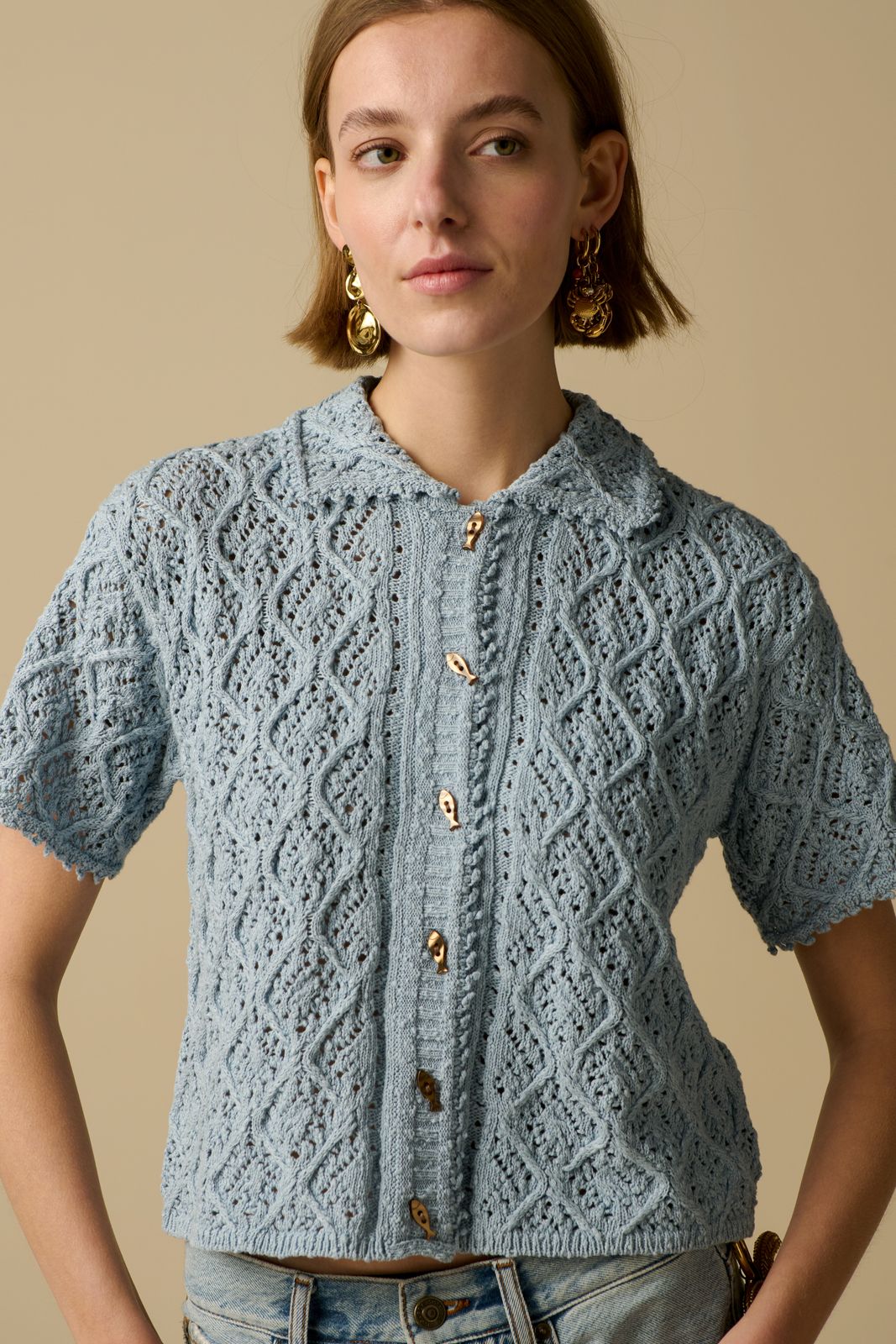 Blauw crochet vest van Sissy-Boy. Het vest heeft korte mouwen, een polokraag en knopen in de vorm van visjes. Verder heeft het vest een blauwe kleur met een all-over gebreid crochet design. Materiaal: 100% katoen.