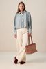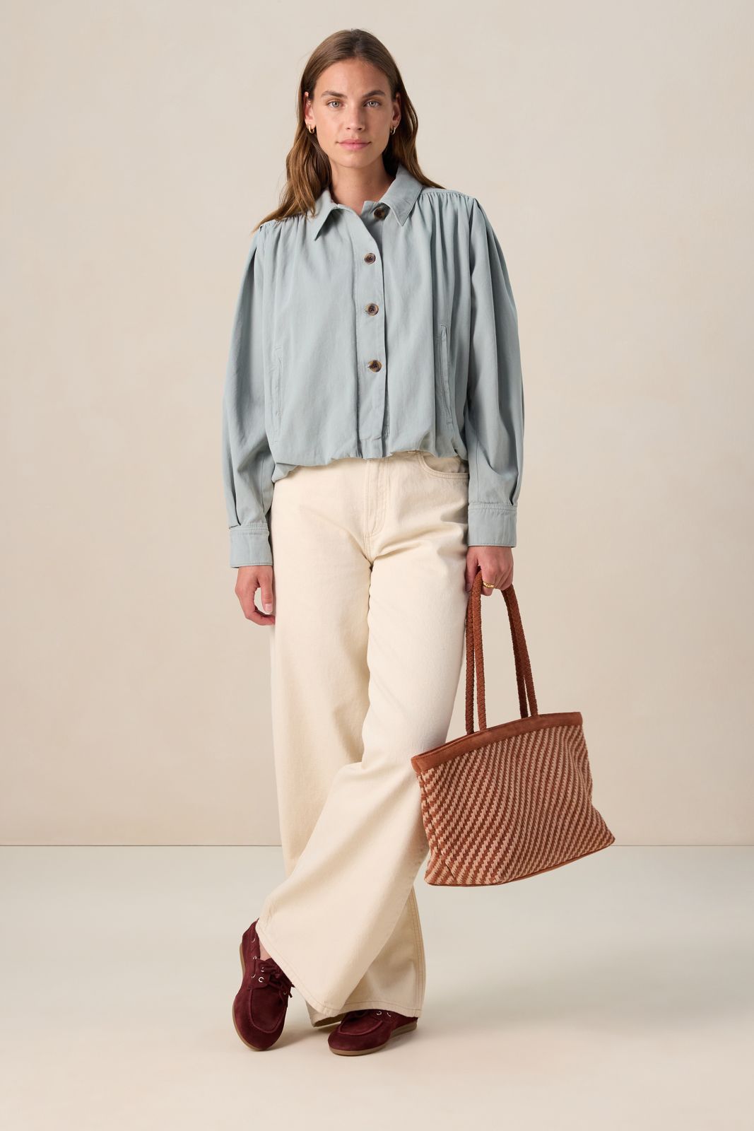 Blauw jack met ballonmouwen van Sissy-Boy. Het jack heeft lange ballonmouwen, een kraag, een relaxed fit, steekzakken en een knoopsluiting. Verder heeft het een blauwe kleur en plooien bij de schouders en mouwen. Het model heeft een lengte van 1,72 m en draagt maat S. Materiaal: 100% katoen.