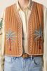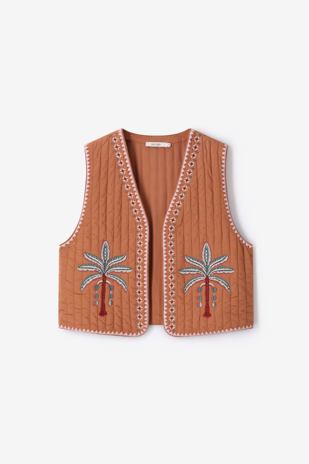Bruin gilet met embroidery van Sissy-Boy. Het gilet is mouwloos, heeft een V-hals en geen sluiting. Verder is het gilet padded en heeft het aan de voorzijde twee embroidery palmbomen met groene details. Materiaal: 100% viscose.