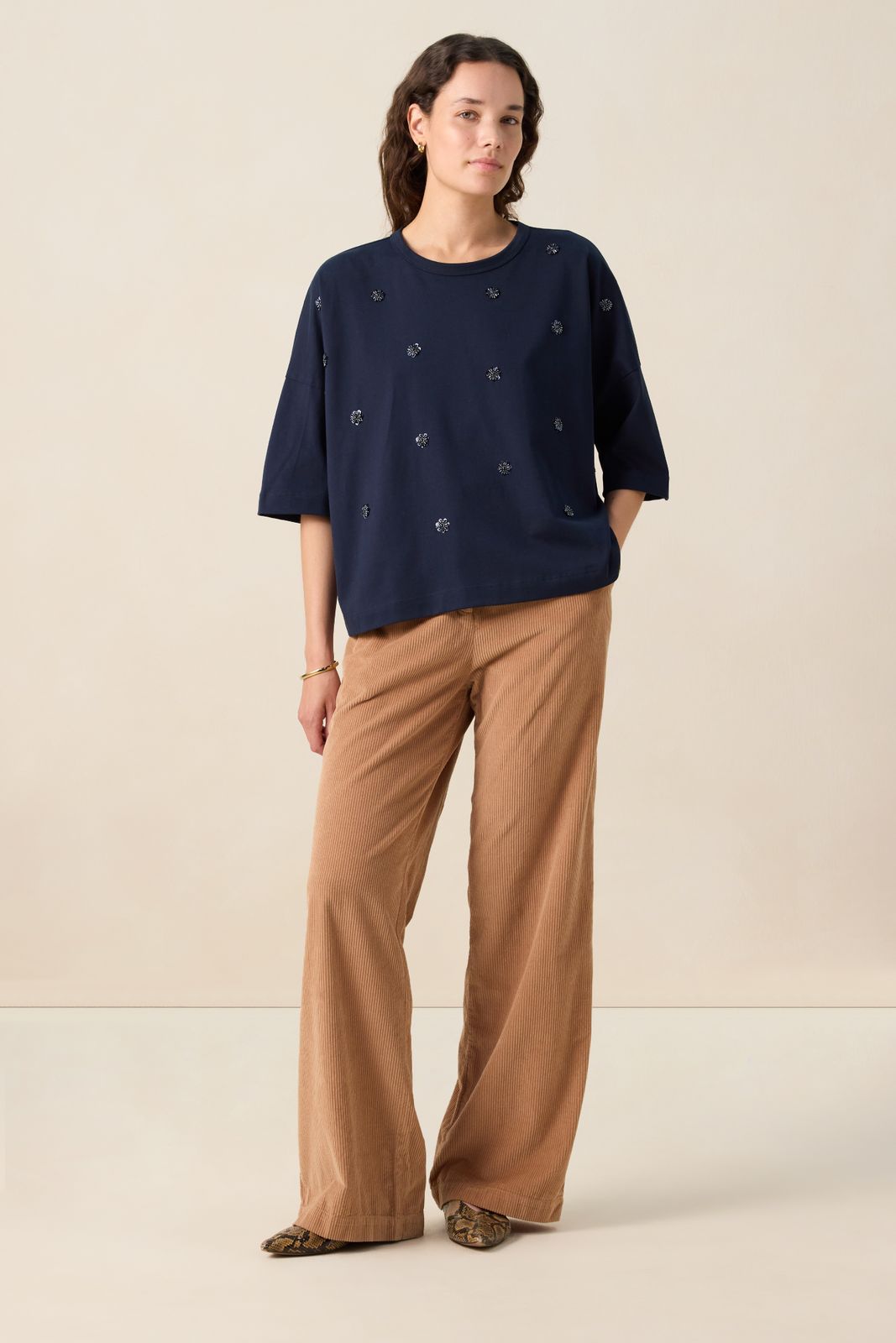 Bruine wide leg corduroy broek van Sissy-Boy. De broek heeft een hoge taille, steekzakken, paspelzakken, wijd uitlopende broekspijpen en een regular fit. Daarnaast heeft de broek een bruine kleur met een corduroy rib kwaliteit. Het model heeft een lengte van 1,74 m en draagt maat S. Materiaal: 100% katoen.