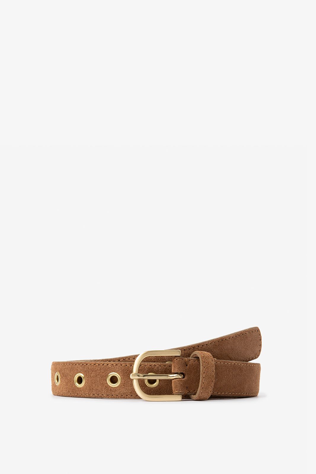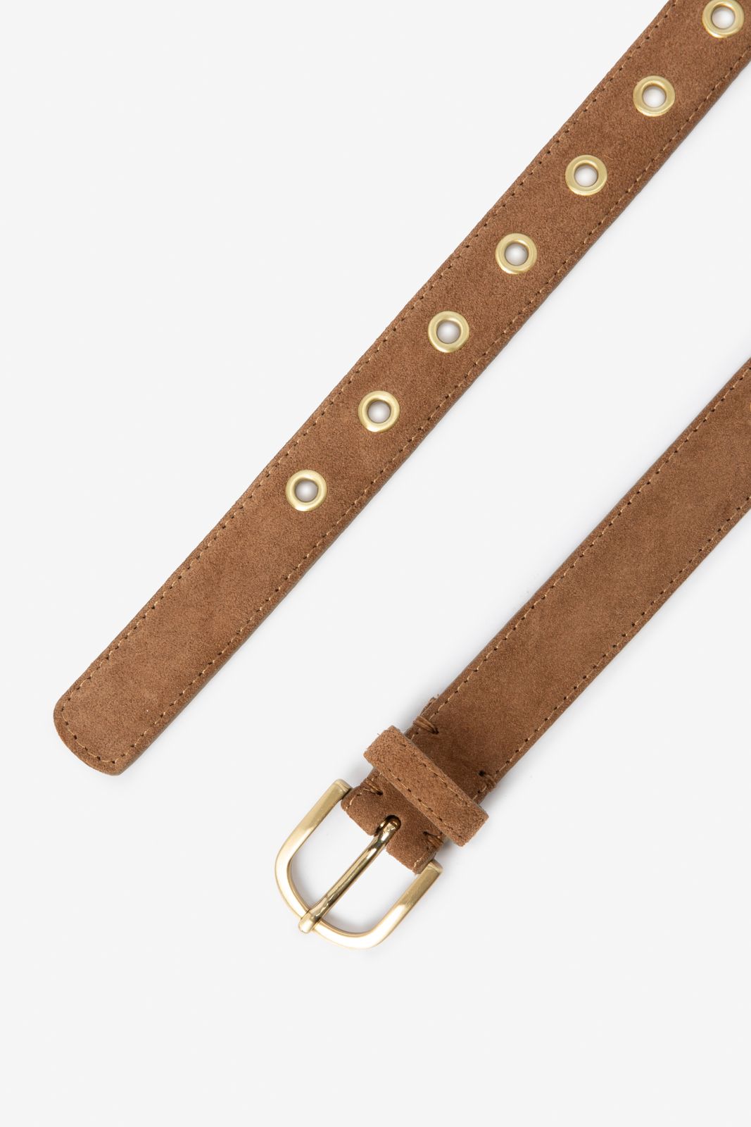 Bruine opengewerkte riem van Sissy-Boy. De riem heeft een opengewerkte studs en gouden gesp. Materiaal: 100% suède.