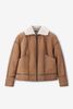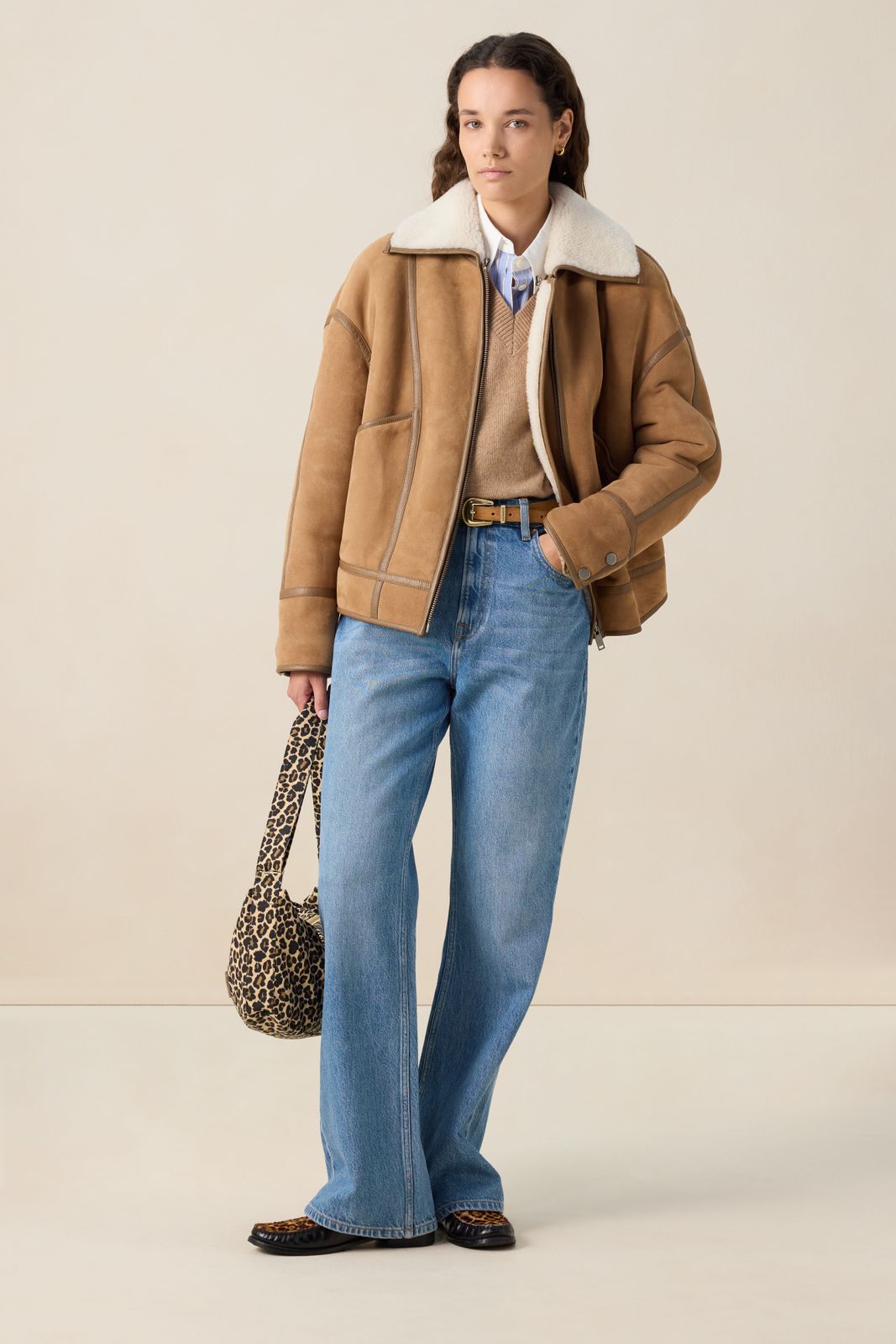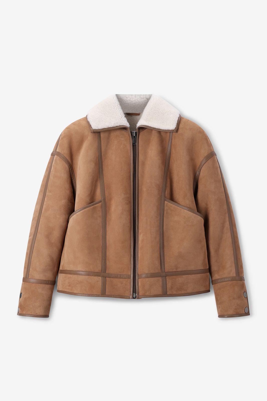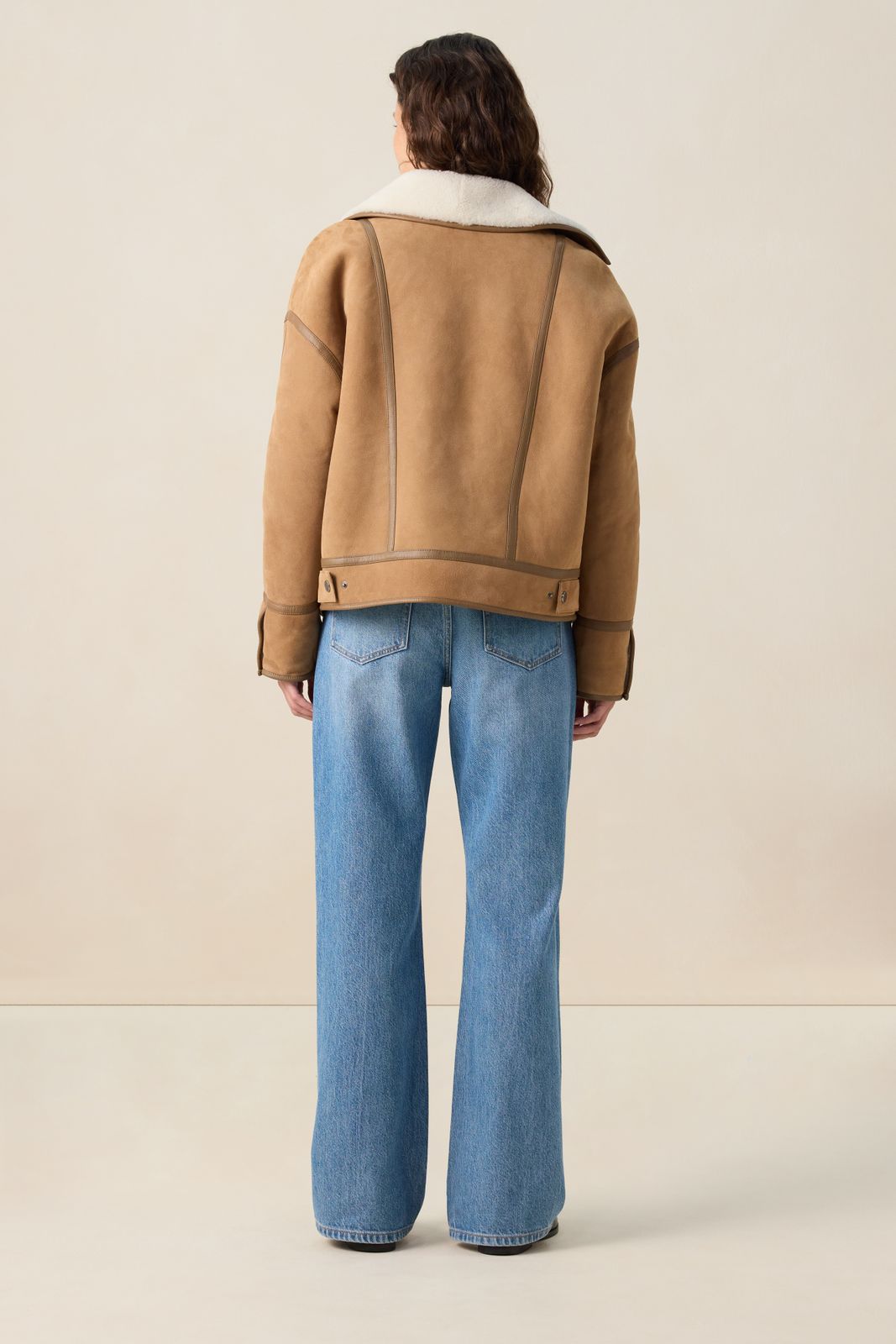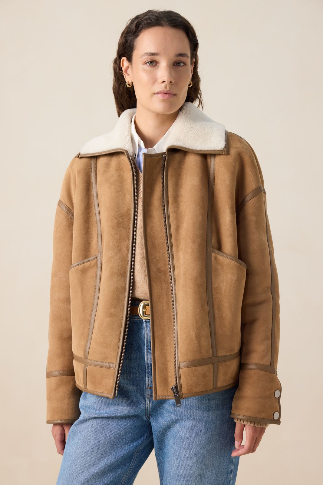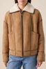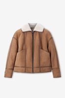 Bruine suède lammy jas van Sissy-Boy. De jas heeft lange mouwen, een omgeslagen lammy kraag, verlaagde schouders en een relaxed fit. Verder heeft de jas twee opgestikte zakken en een ritssluiting. Door de lammy stof is de jas aan de binnenzijde helemaal van schapenwol. Het model heeft een lengte van 1,74 m en draagt maat S. Materiaal: 100% leer.