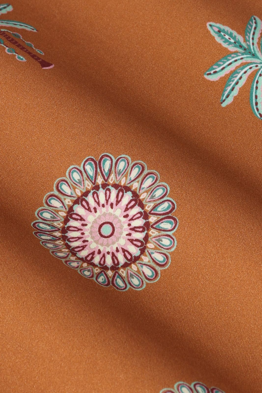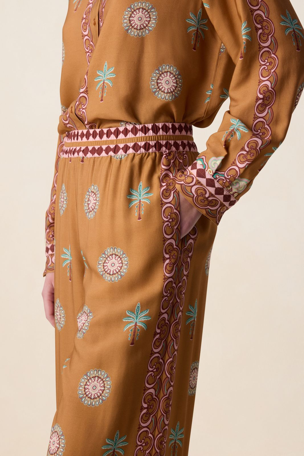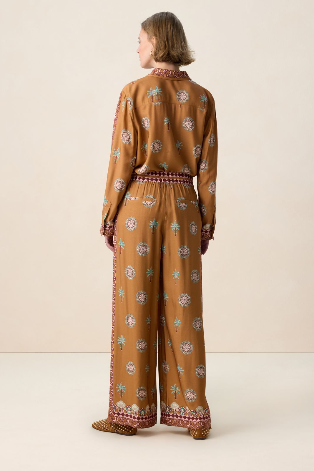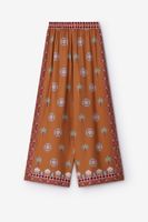 Bruine wide leg broek met palm print van Sissy-Boy. De broek heeft een hoge taille, wijd uitlopende broekspijpen, een elastische tailleband en paspelzakken aan de achterzijde. Verder heeft de broek een bruine kleur met een palmbomen print en multicolour details. Materiaal: 100% viscose.