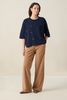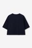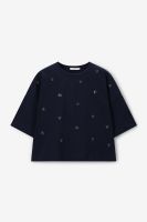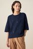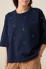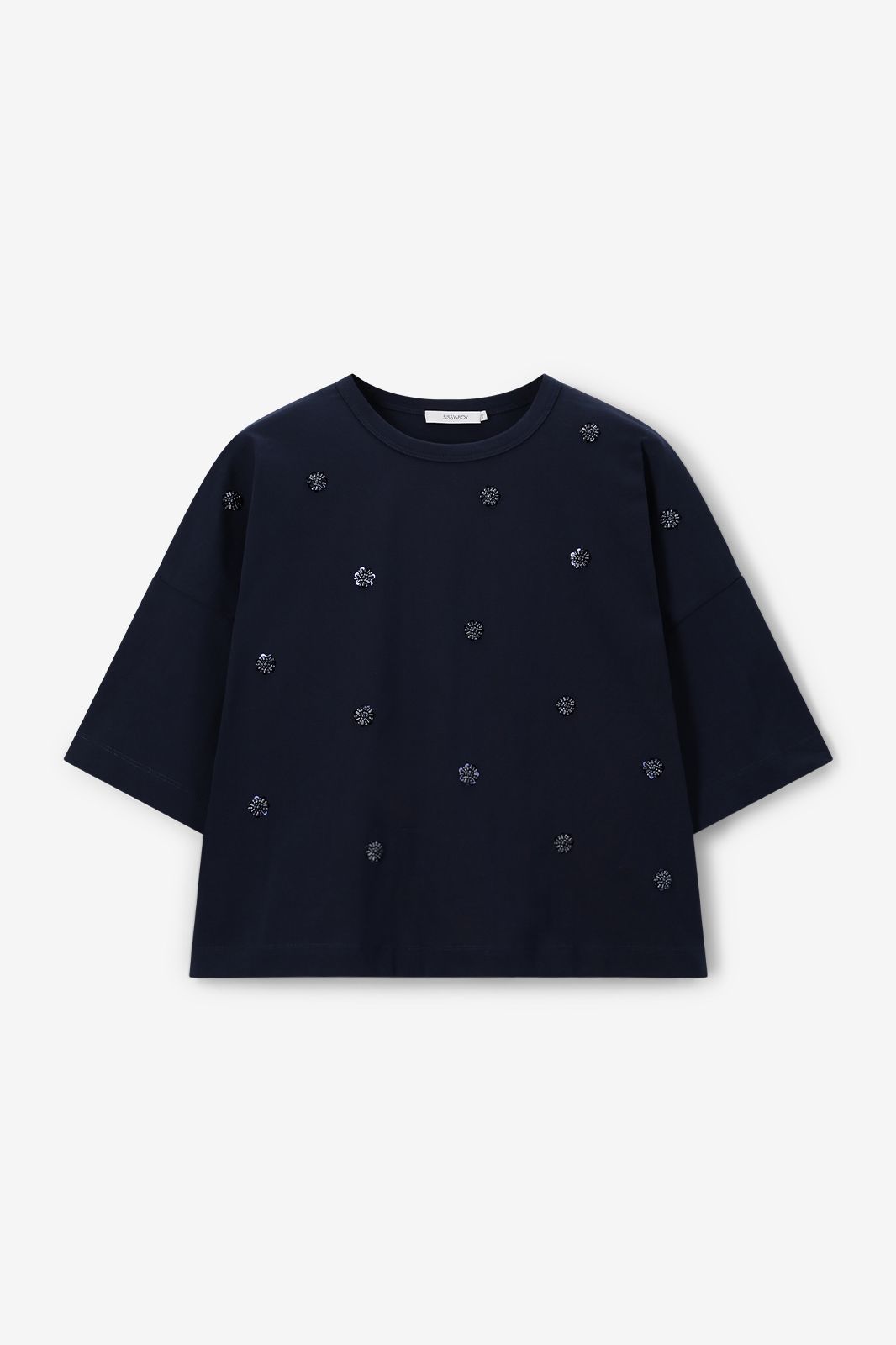 Donkerblauw oversized T-shirt met kralen van Sissy-Boy. Het T-shirt heeft korte mouwen, een hoge ronde halslijn en een oversized fit. Daarnaast heeft het een korte boxy fit, een donkerblauwe kleur met aan de voorzijde blauwe kralen. Het model heeft een lengte van 1,74 m en draagt maat XS-S. Materiaal: 100% katoen.