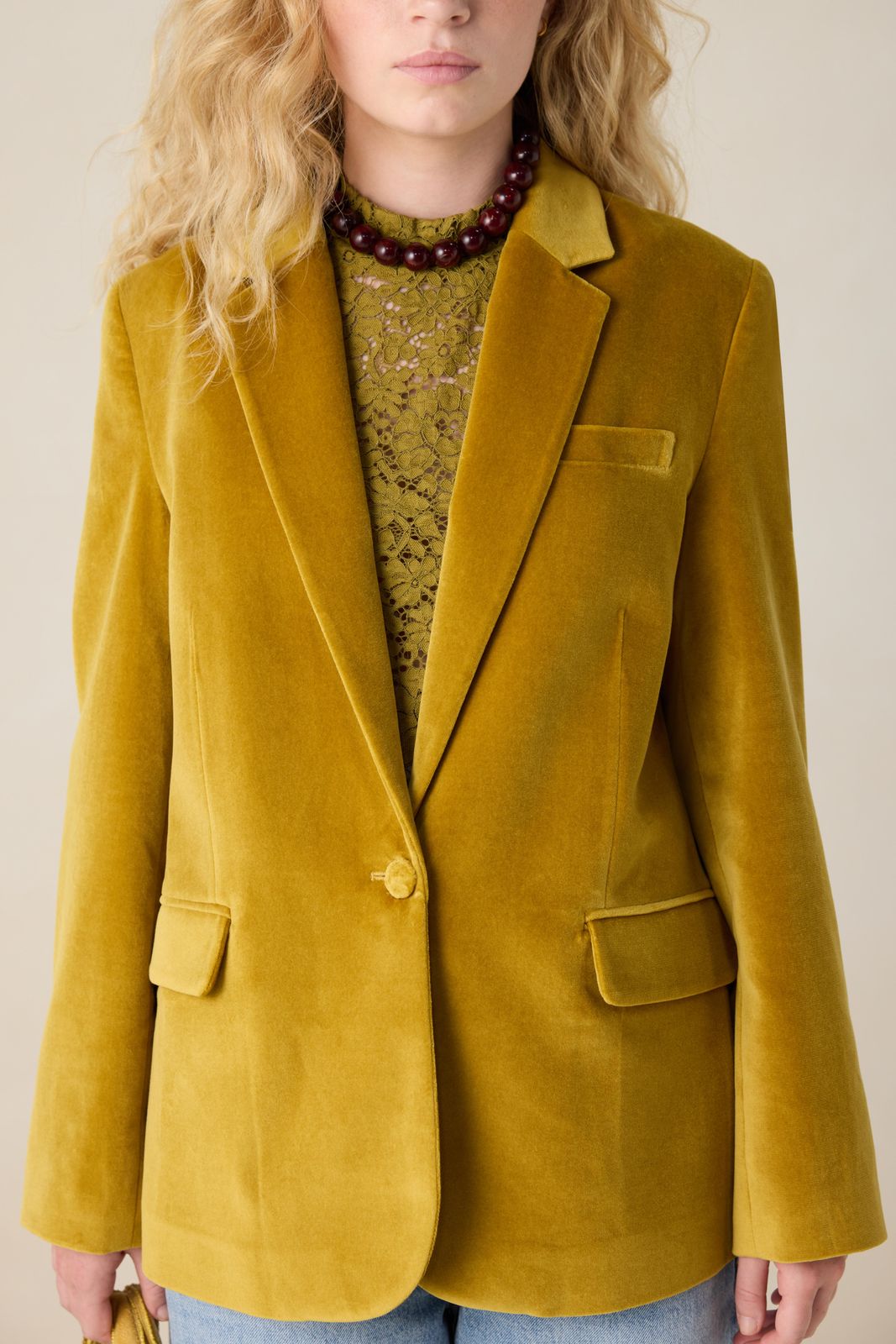 Gele velvet blazer van Sissy-Boy. De velvet blazer heeft lange mouwen, een knoopsluiting, klepzakken en een regular fit. Het model heeft een lengte van 1,71 m en draagt maat S. Materiaal: 100% katoen.