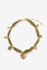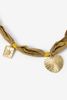 Donkergroene cord ketting met bedels van Sissy-Boy. De ketting heeft een donkergroene band met gouden bedels in verschillende vormen. Vermijd contact met cosmetica (zoals parfum, haarlak, make-up, nagellakremover, lichaamsolie, zonnebrandolie, handgel en deodorant). Draag geen sieraden tijdens het douchen, baden of zwemmen. Met name chloor kan de sieraden permanent beschadigen of verkleuren. Materiaal: 50% katoen, 30% metaal, 15% bras, 5% steen.