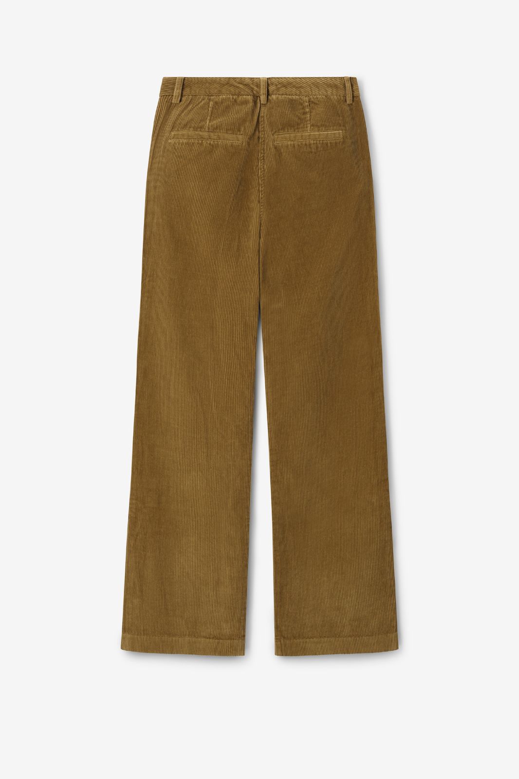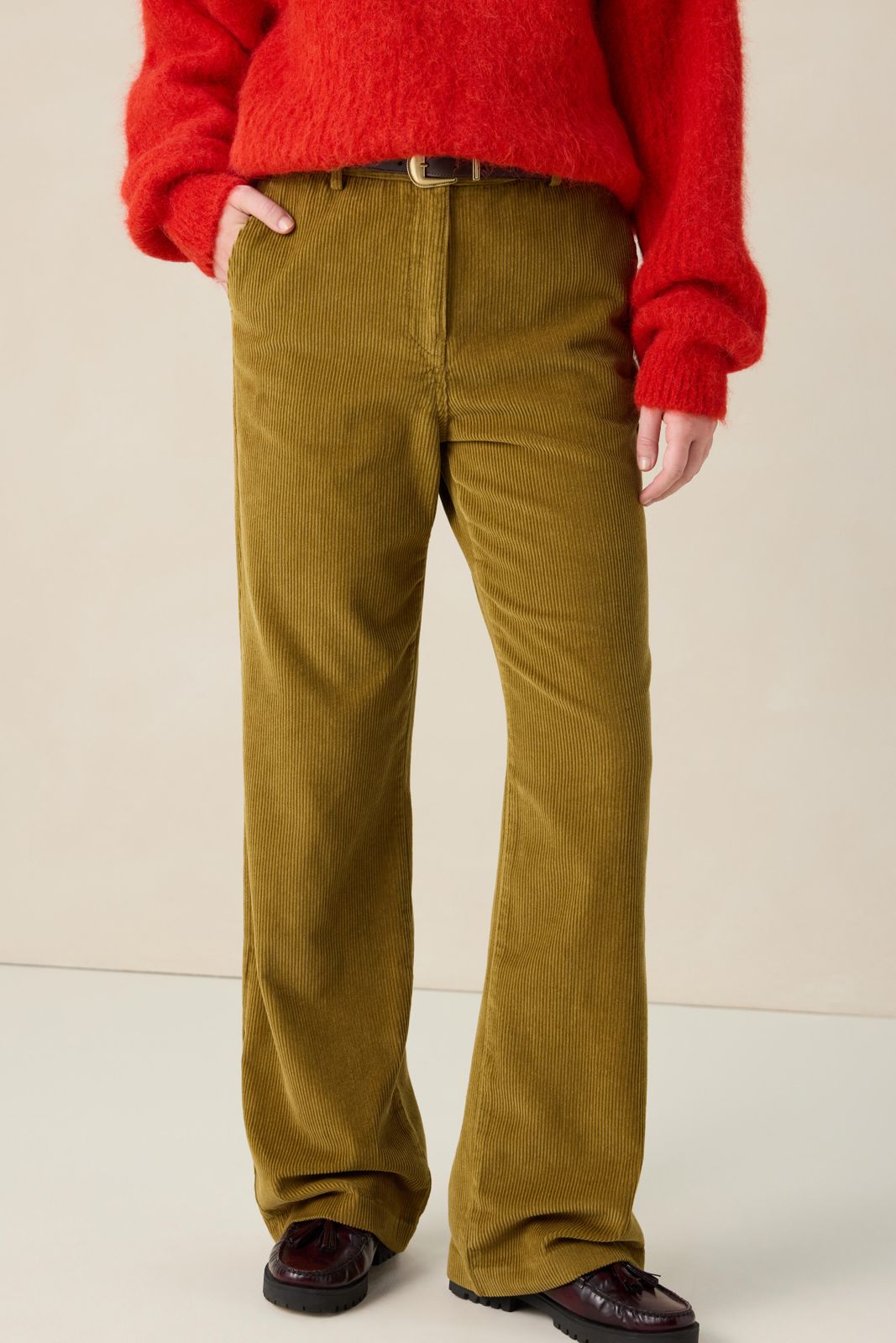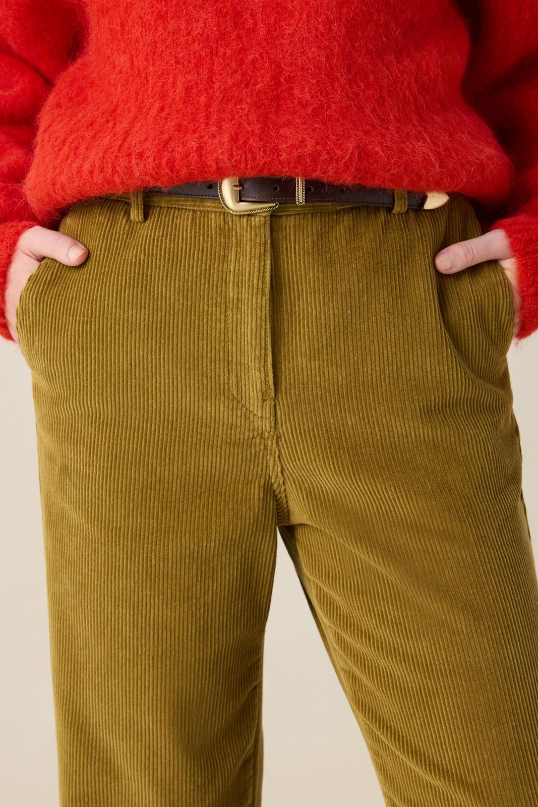 Groene corduroy broek in een straight leg model met twee steekzakken aan de voorkant, twee paspelzakken aan de achterkant, een knoop en een ritssluiting. Het model heeft een lengte van 1,71 m en draagt maat S. Materiaal: 100% katoen.