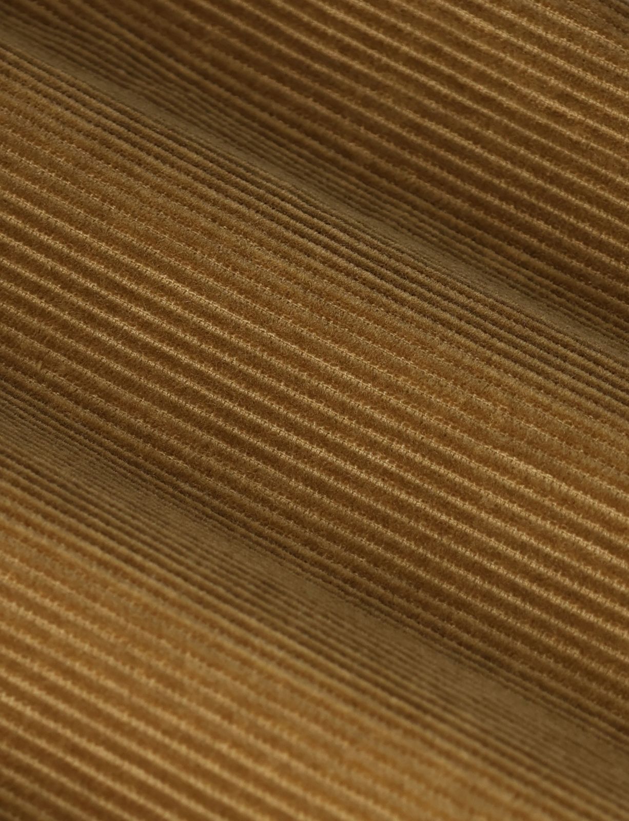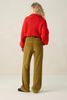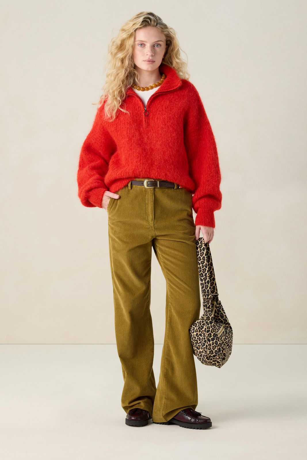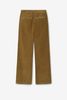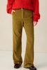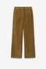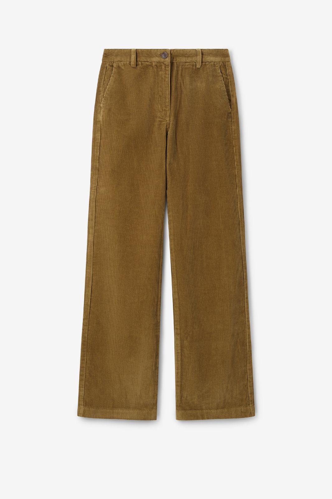 Groene corduroy broek in een straight leg model met twee steekzakken aan de voorkant, twee paspelzakken aan de achterkant, een knoop en een ritssluiting. Het model heeft een lengte van 1,71 m en draagt maat S. Materiaal: 100% katoen.
