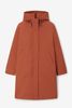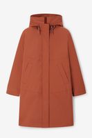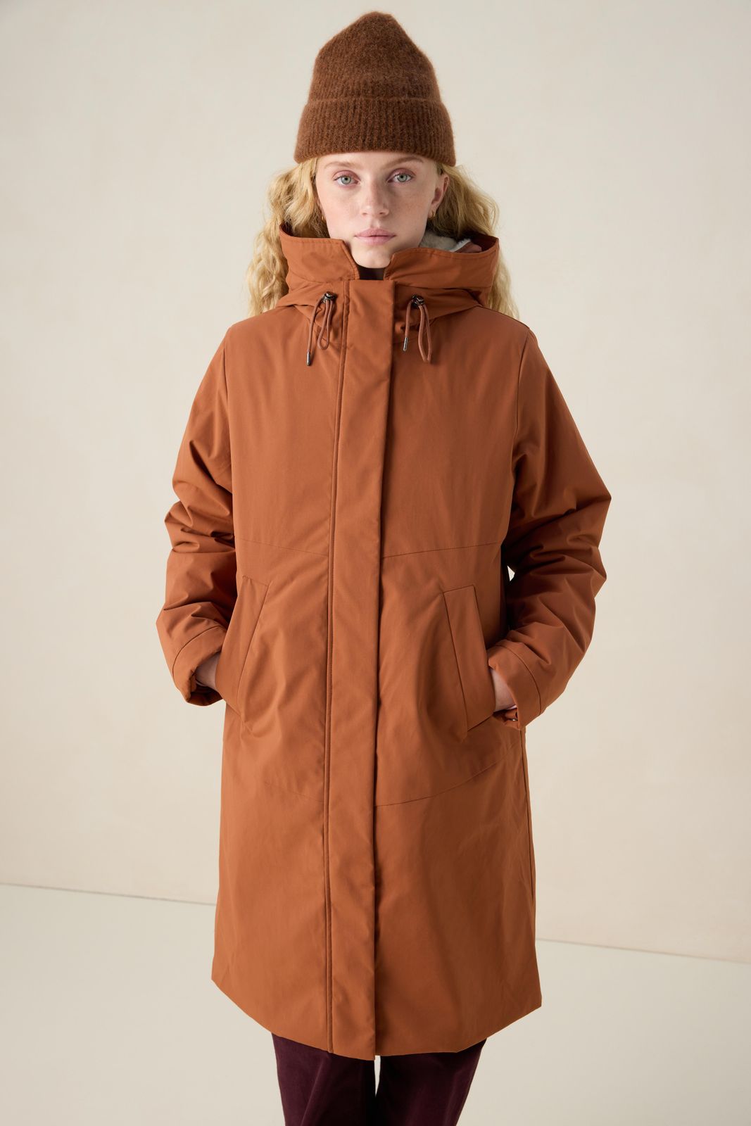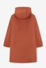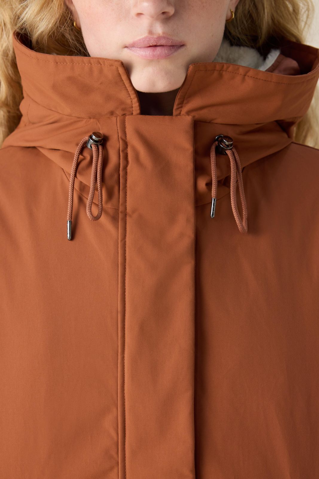 Donkeroranje parka van Sissy-Boy. De jas heeft lange mouwen, een ritssluiting, een capuchon, drukknoopsluiting, steekzakken en een binnenzak. Daarnaast heeft het een donkeroranje kleur, een faux fur voering en een uitneembare binnenjas. Het model heeft een lengte van 1,71 m en draagt maat S. Materiaal: 100% nylon.