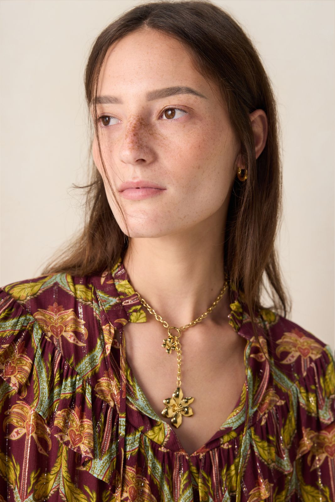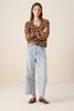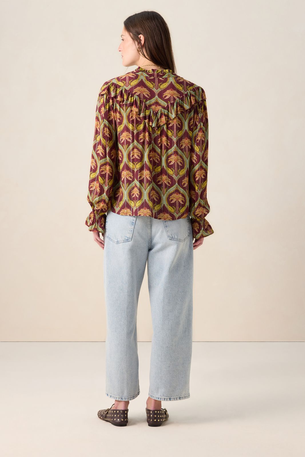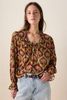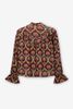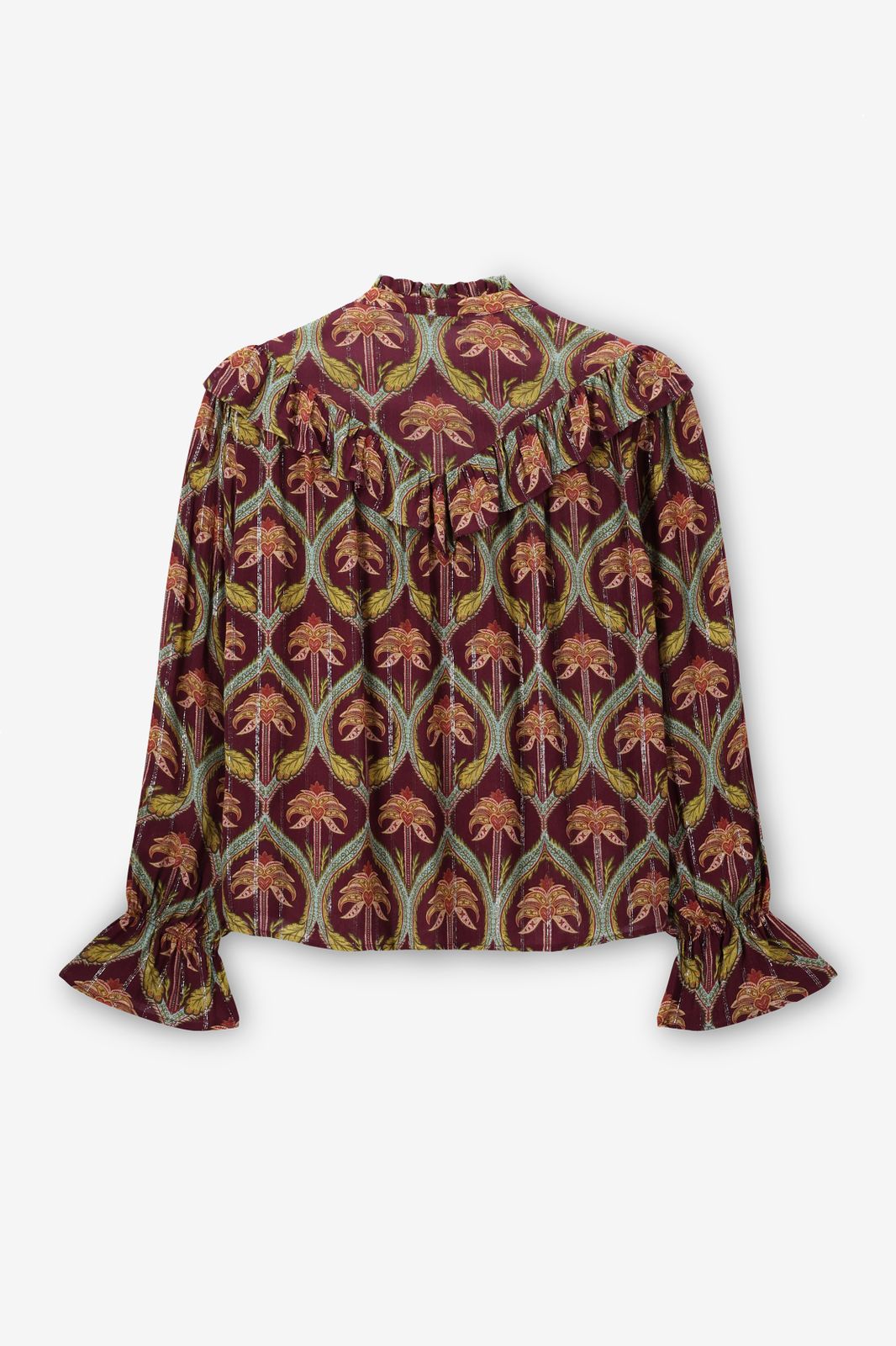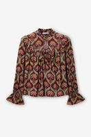 Donkerrode blouse met palm print van Sissy-Boy. De blouse heeft lange pofmouwen, een ronde hals, een peter pan kraag en een ruffle detail rond de hals en mouwen. Verder heeft de blouse een donkerrode kleur met all-over palmbomen print. Het model heeft een lengte van 1,77 en draagt maat S. Materiaal: 98% viscose, 2% polyester.