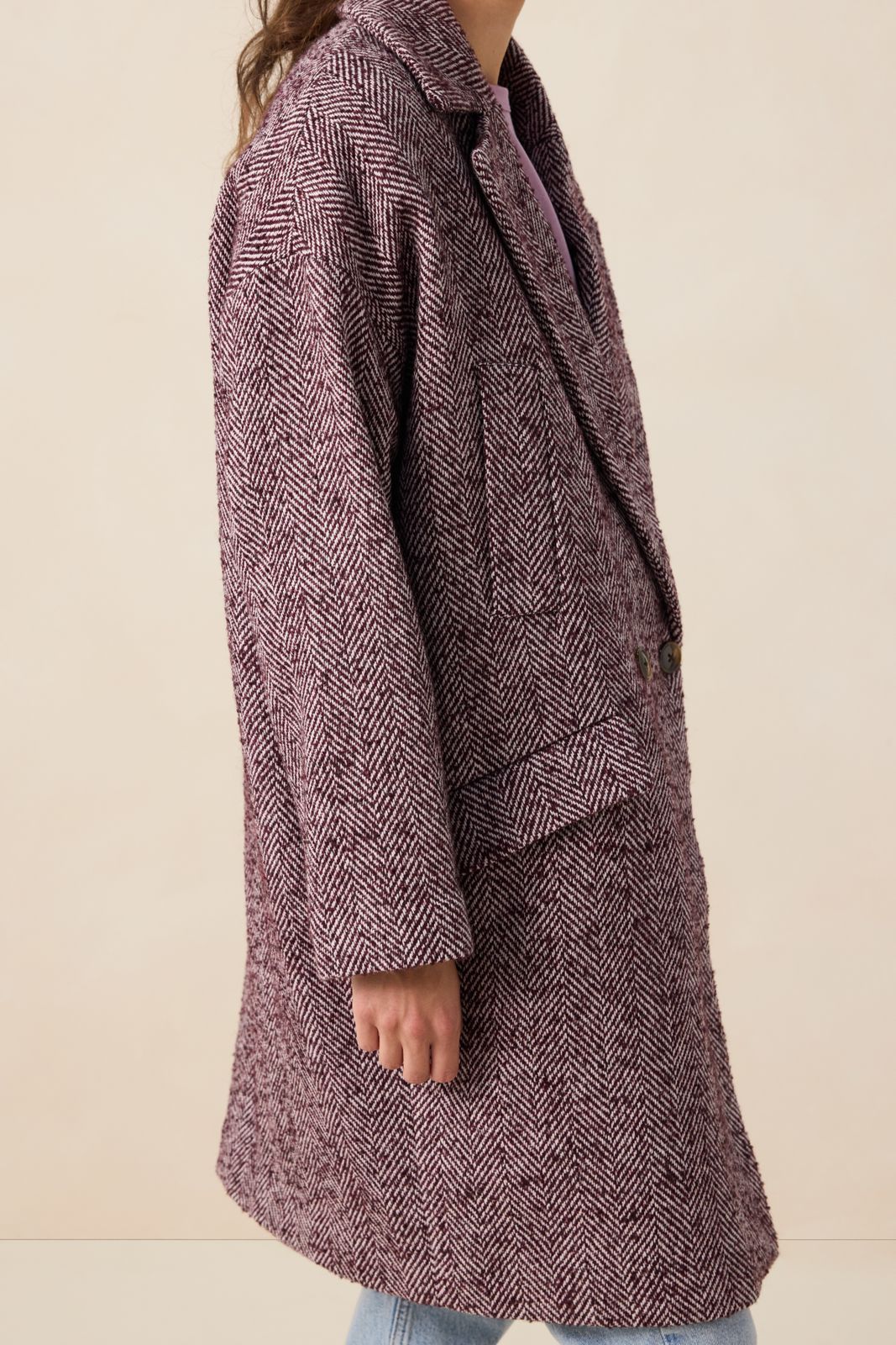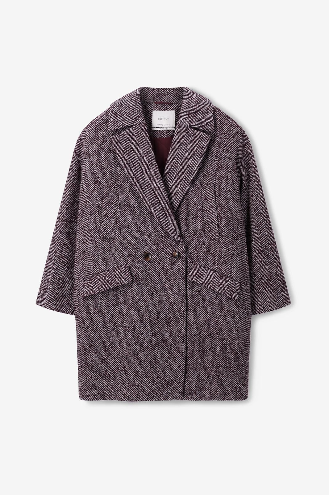 Donkerrode wollen herringbone geruite jas van Sissy-Boy. De jas heeft lange mouwen, een reverskraag, een knoopsluiting, steekzakken aan de voorzijde en een regular fit. Daarnaast heeft het een all-over geruite herringbone patroon in de stof verwerkt. Materiaal: 30% wol, 70% polyester.