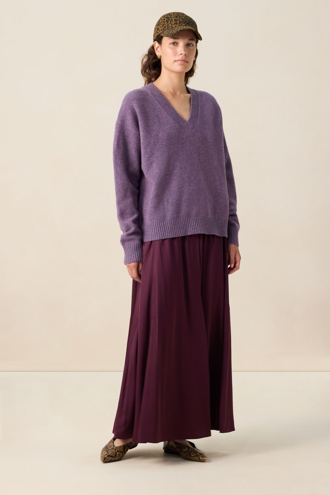 Donkerrode maxi rok van Sissy-Boy. De rok heeft een hoge taille, een elastiekenband en een lang uitlopend model. Het model heeft een lengte van 1,74 m en draagt maat S. Materiaal: 100% viscose.