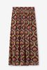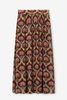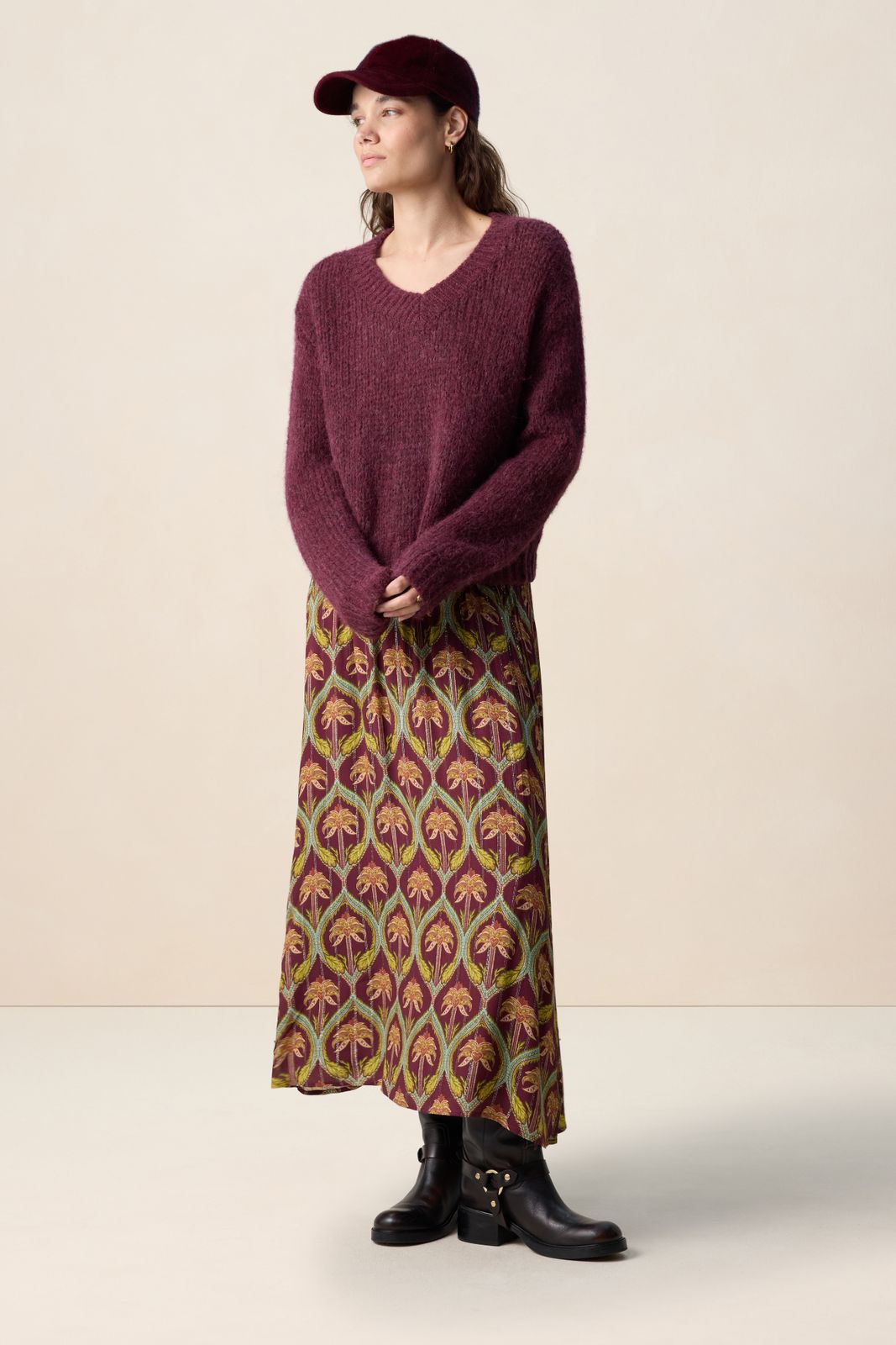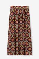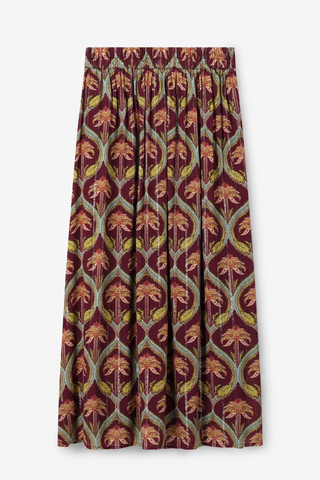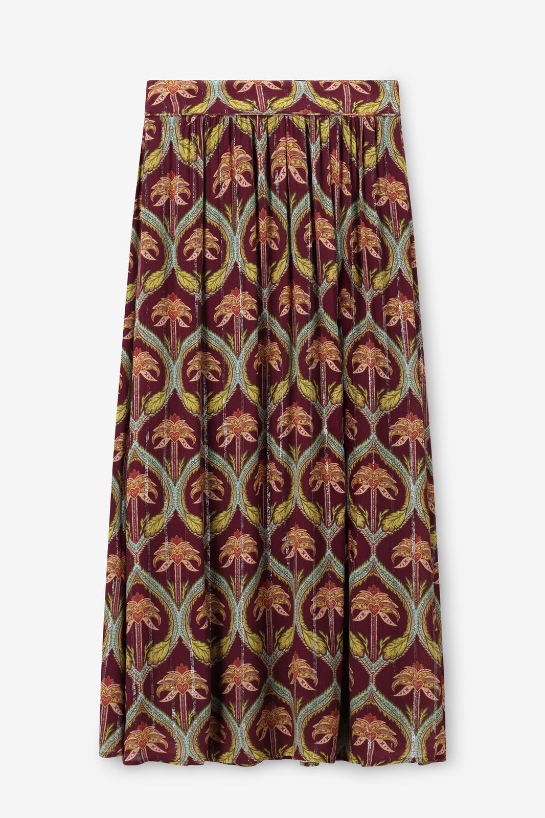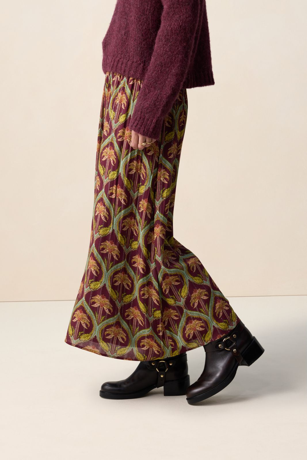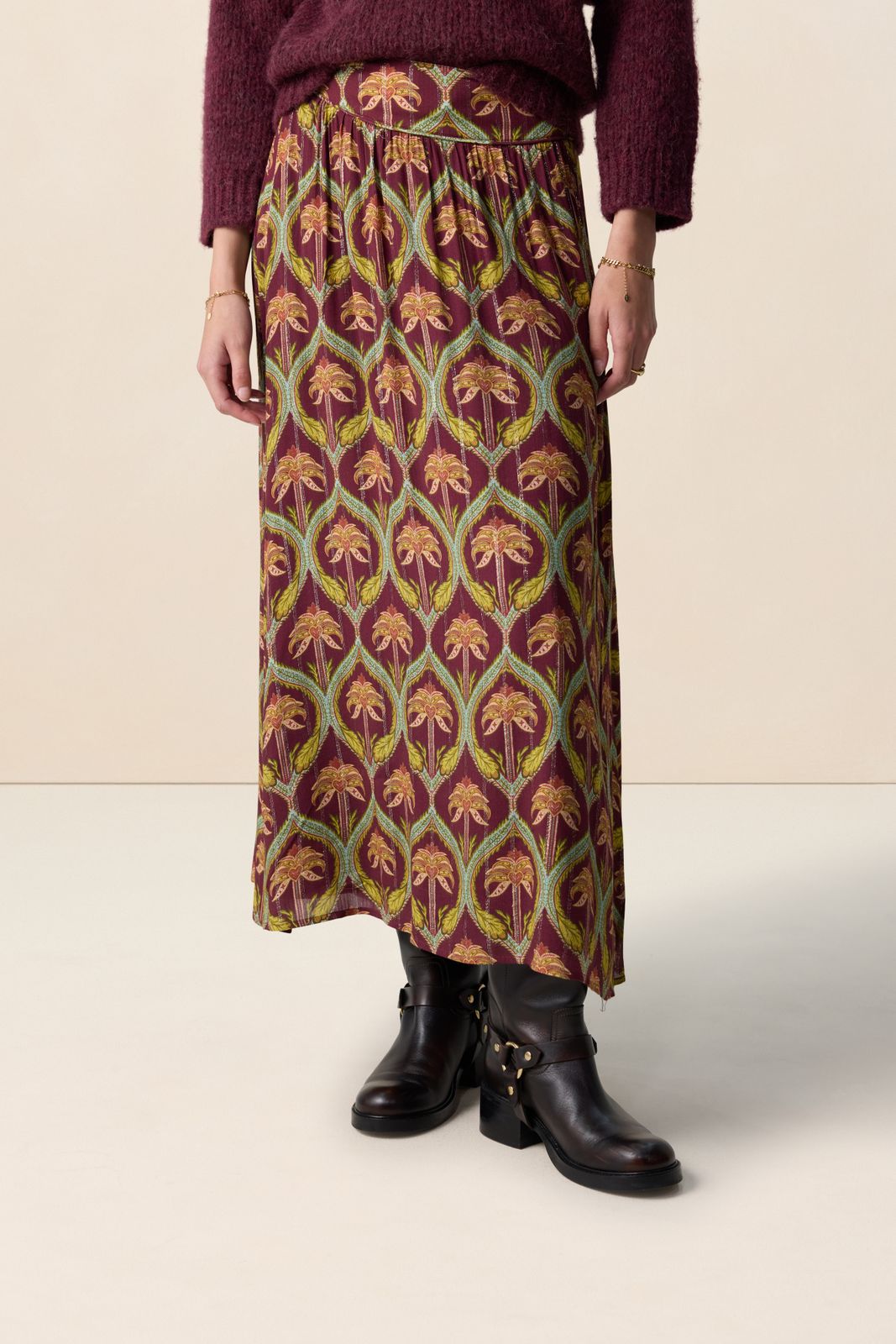 Donkerrode maxi rok met palm print van Sissy-Boy. De rok heeft een tailleband en is aan de bovenzijde geplooid. Verder heeft de rok een donkerrode kleur met een all-over palmbomem print en lurex glitter details in de stof verwerkt. Materiaal: 98% viscose, 2% polyester.