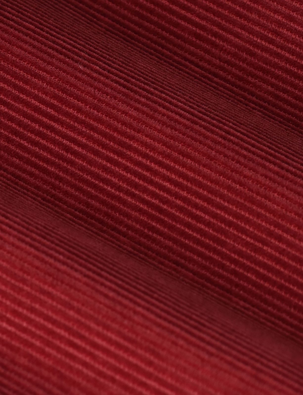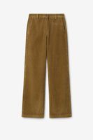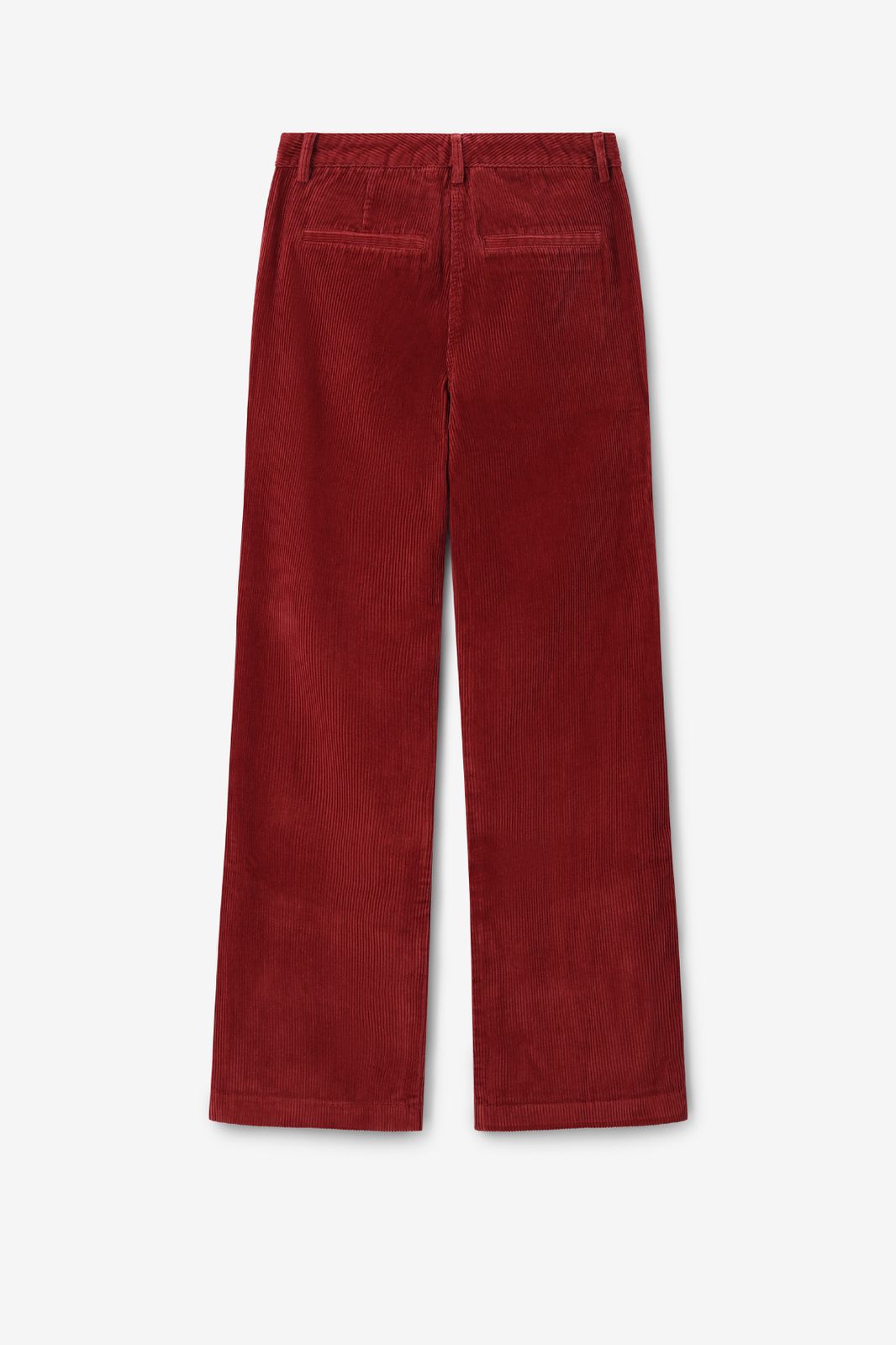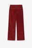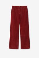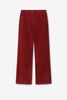 Rode corduroy broek in een straight leg model met twee steekzakken aan de voorkant, twee paspelzakken aan de achterkant, een knoop en een ritssluiting. Het model heeft een lengte van 1,71 m en draagt maat S. Materiaal: 100% katoen.