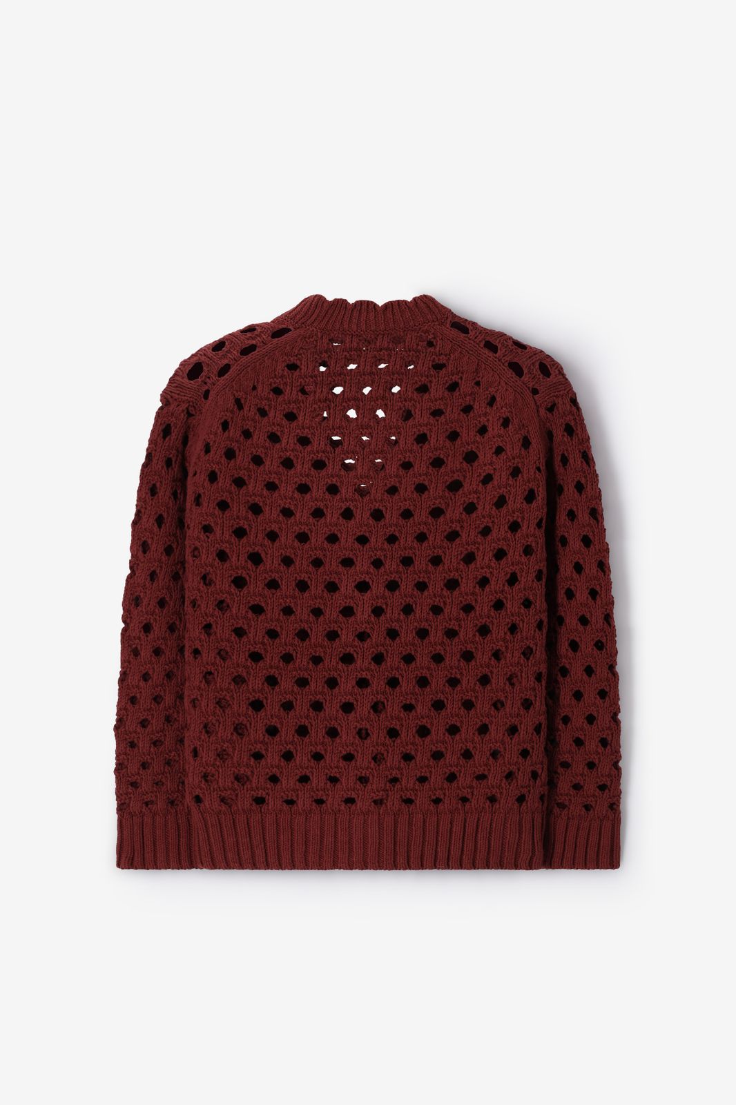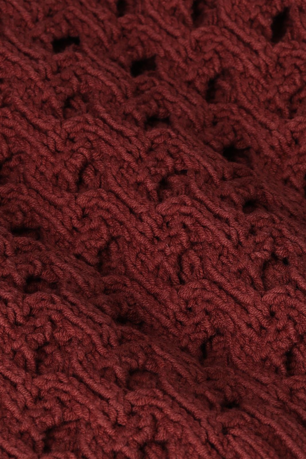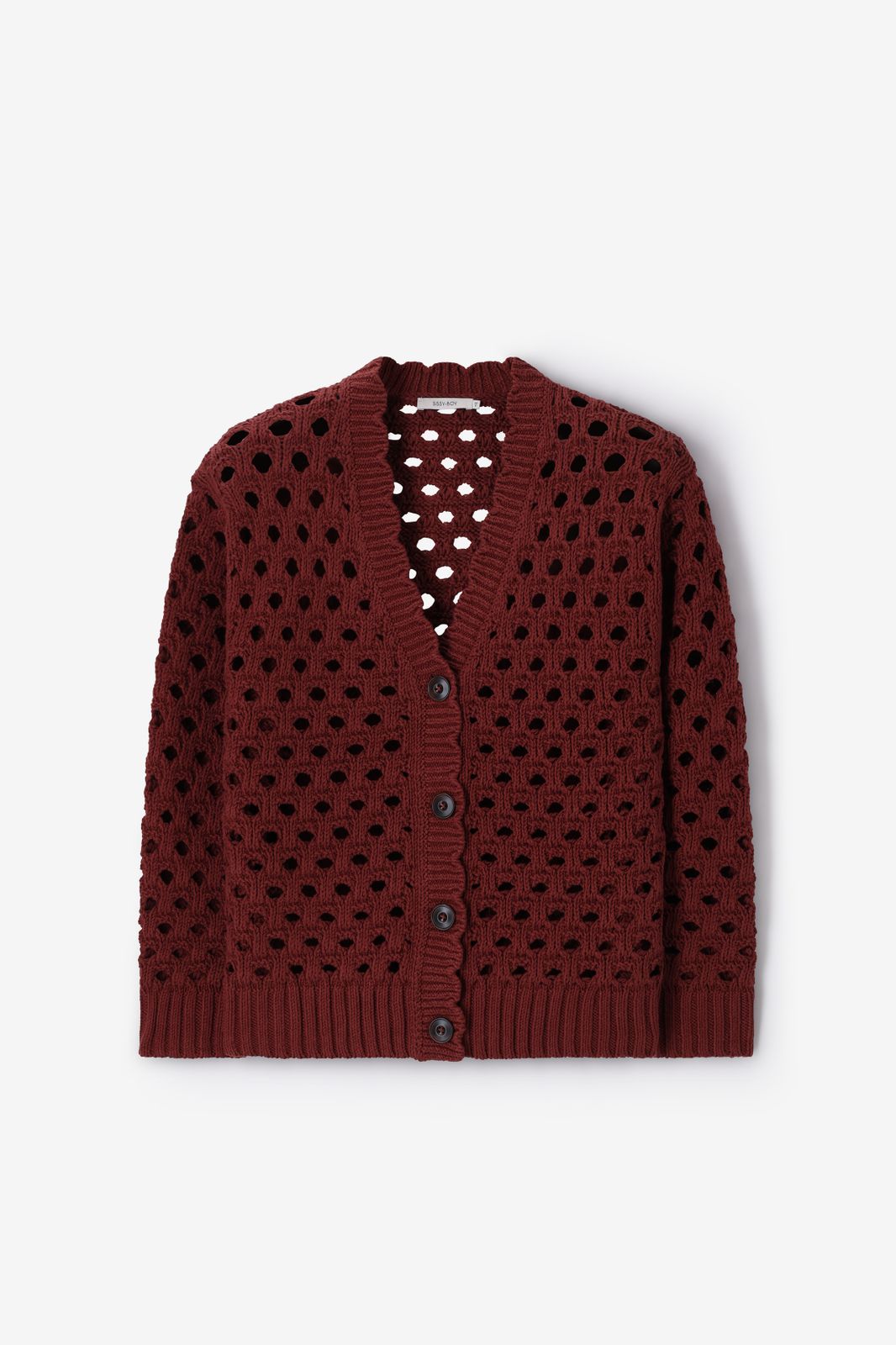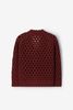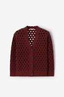 Donkerrood opengewerkt vest van Sissy-Boy. Het vest heeft lange mouwen, een V-hals, een knoopsluiting en een oversized fit. Verder heeft het vest een donkerrode kleur met gebreide opengewerkte details. Materiaal: 60% katoen, 40% acryl.