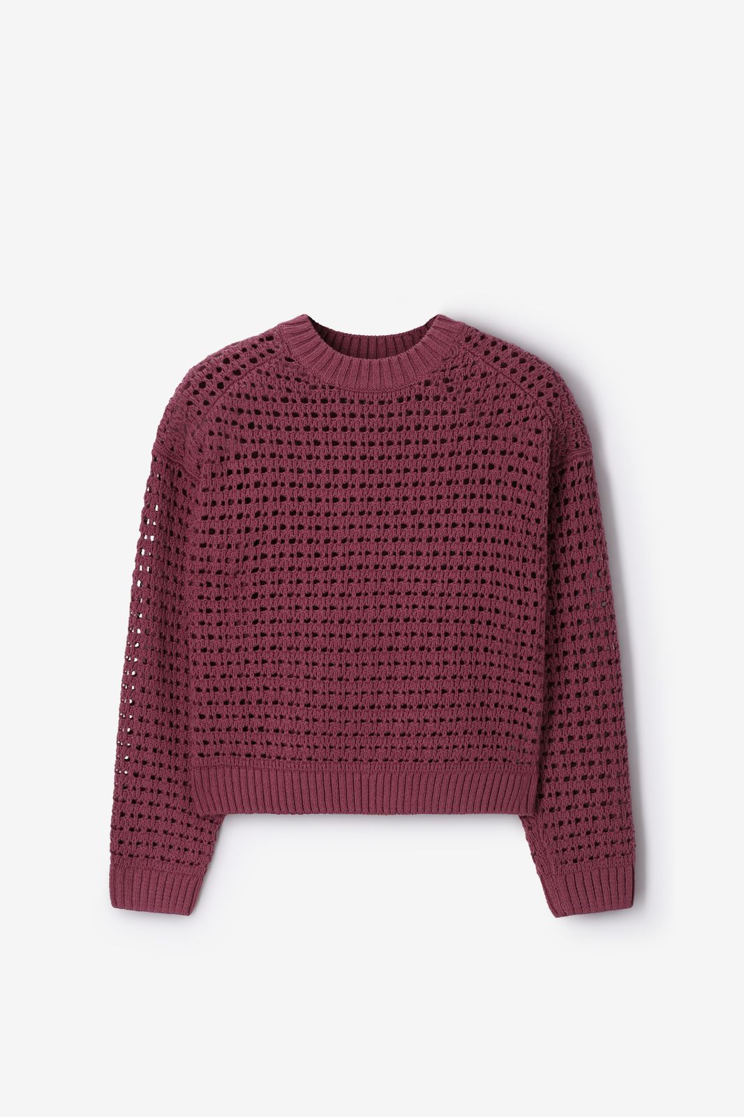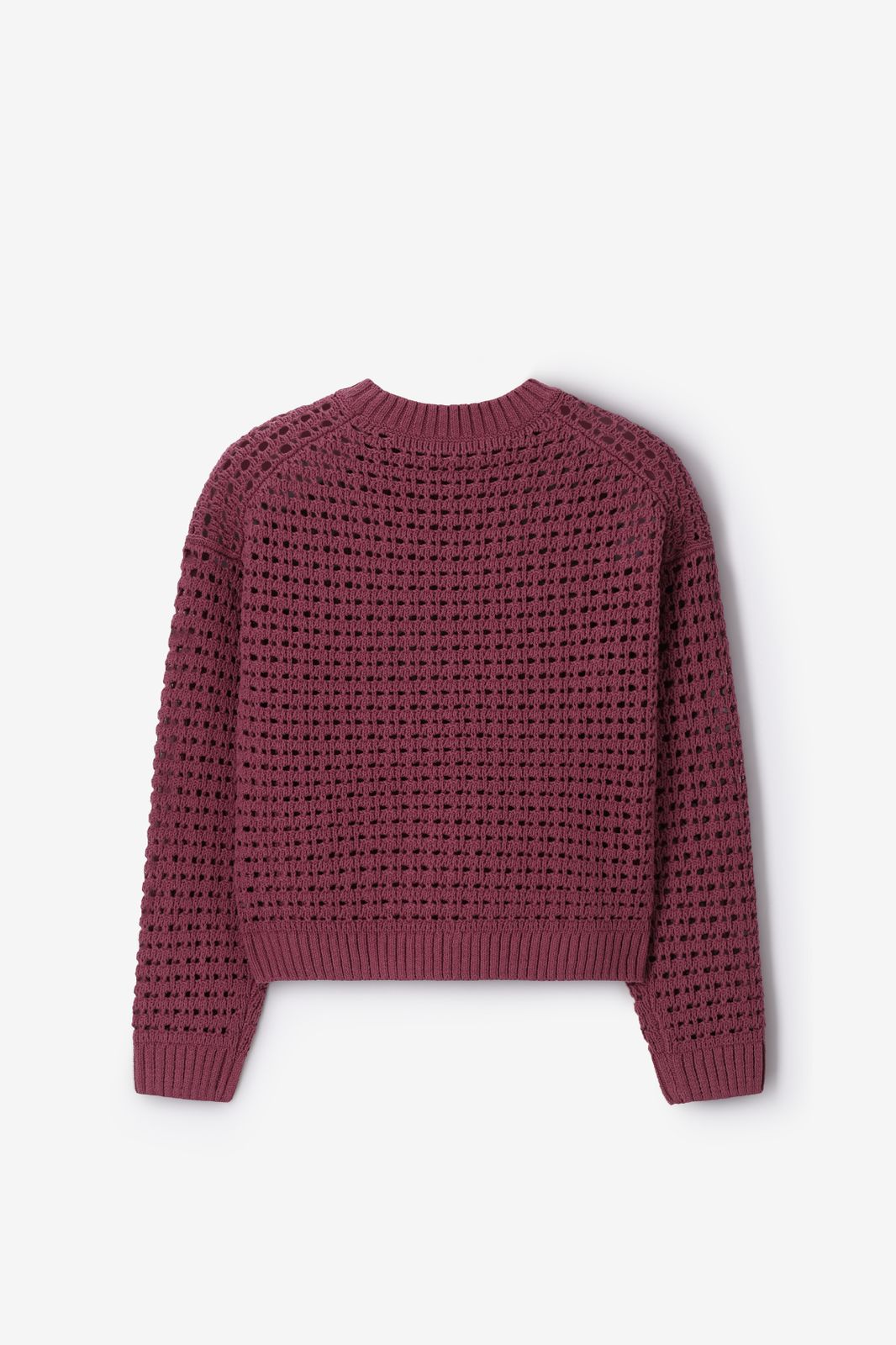 Donkerroze open gebreide trui van Sissy-Boy. De trui heeft lange mouwen, een ronde halslijn en een relaxed fit. Verder heeft de trui een donkerroze kleur met gebreide opengewerkte details in de stof. Materiaal: 60% katoen, 40% acryl.