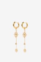 Gouden oorbellen met zonnetjes van Sissy-Boy. De oorbellen hebben een ringetje met daaronder drie zonnetjes in verschillende groottes. Onderhoud sieraden Sissy-Boy: Vermijd contact met cosmetica (zoals parfum, haarlak, make-up, nagellakremover, lichaamsolie, zonnebrandolie, handgel en deodorant). Draag geen sieraden tijdens het douchen, baden of zwemmen. Met name chloor kan de sieraden permanent beschadigen of verkleuren. Afmetingen: 8 cm x 2 cm. Materiaal: 100% staal.