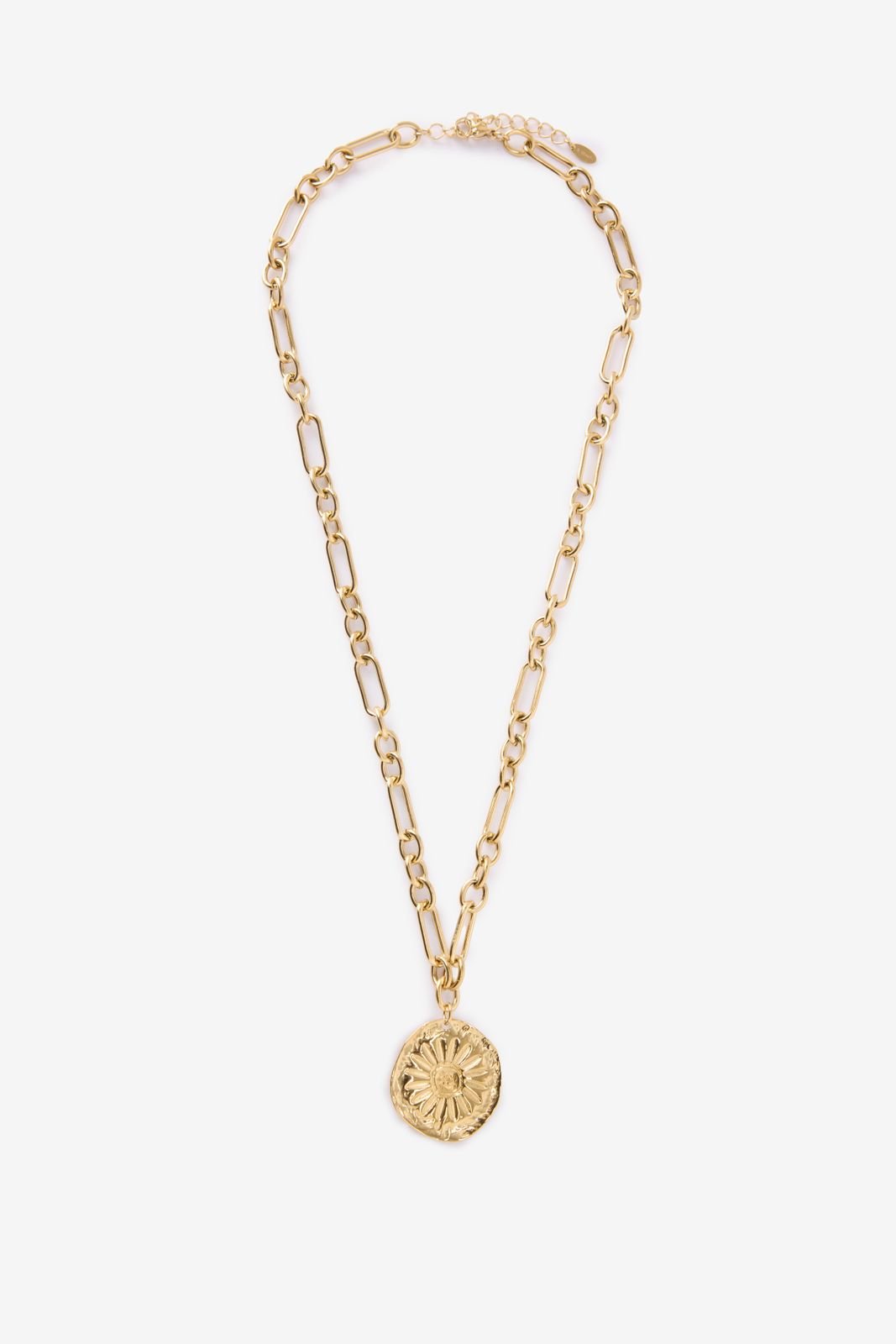 Gold plated schakelketting met muntje van Sissy-Boy. De goudkleurige schakelketting is verstelbaar en heeft een gouden muntje met een bloem als bedel. Onderhoud sieraden Sissy-Boy: Vermijd contact met cosmetica (zoals parfum, haarlak, make-up, nagellakremover, lichaamsolie, zonnebrandolie, handgel en deodorant). Draag geen sieraden tijdens het douchen, baden of zwemmen. Met name chloor kan de sieraden permanent beschadigen of verkleuren. Afmetingen: 50 cm + 5 cm. Materiaal: 100% staal.