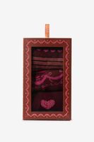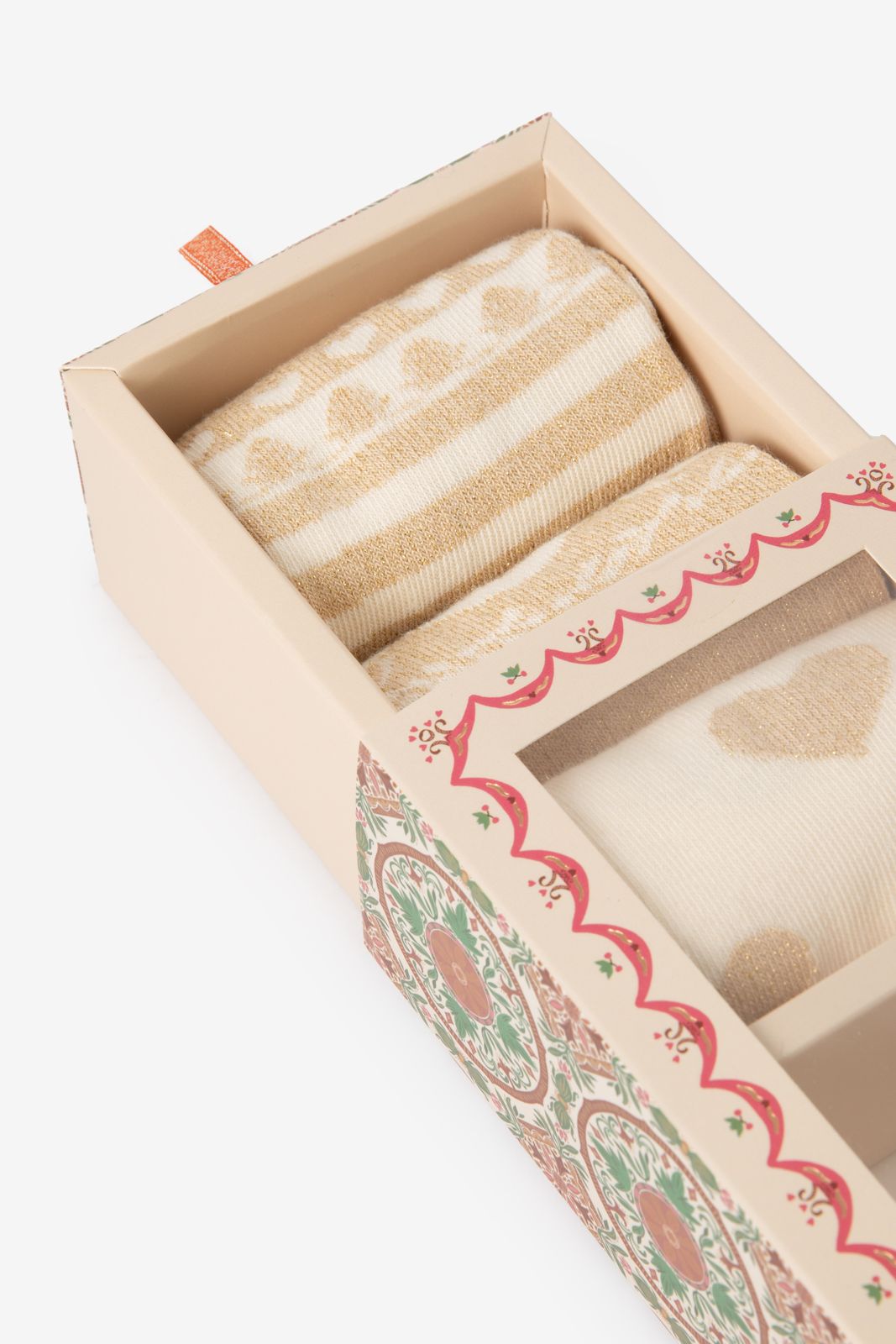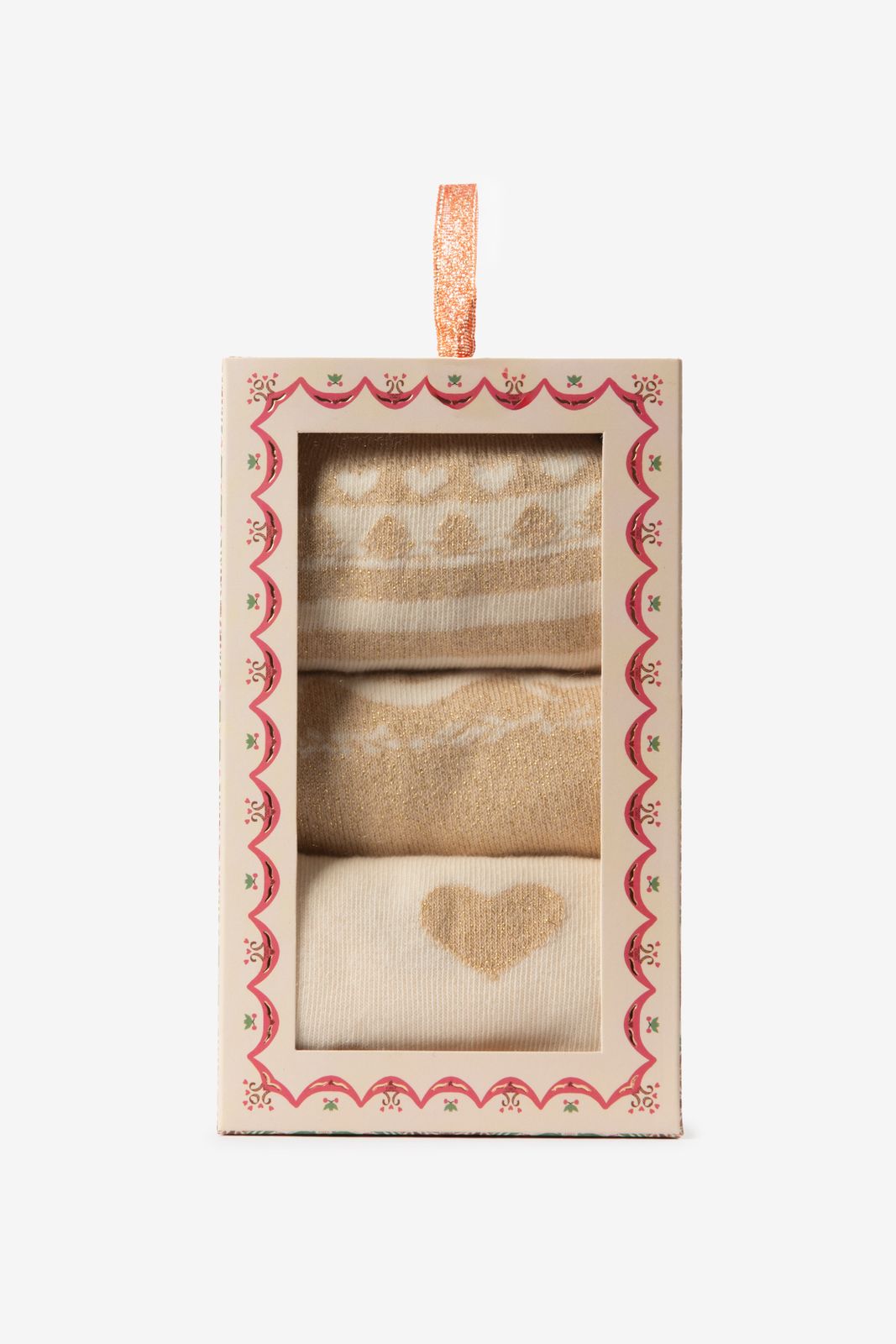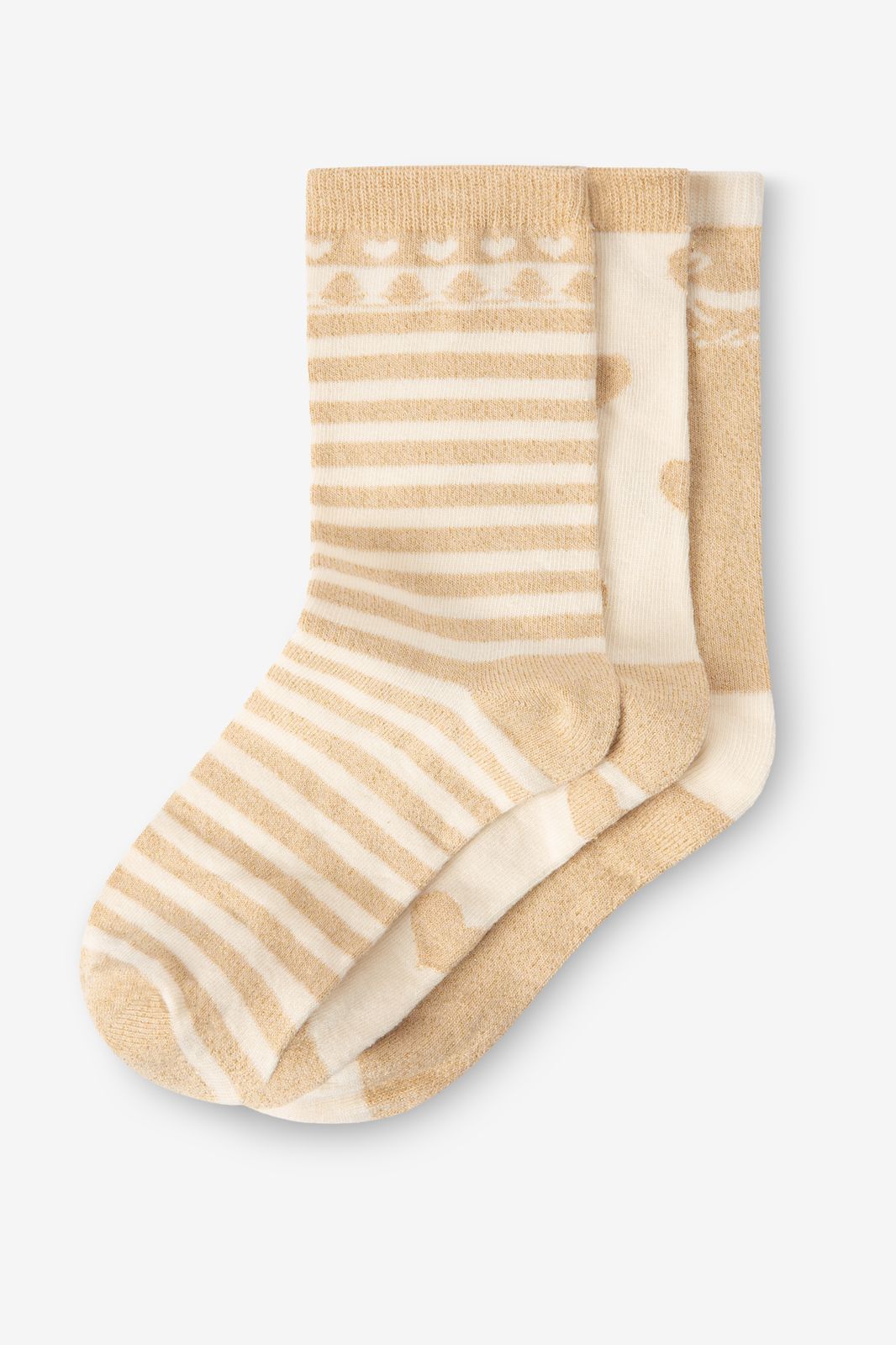 Gouden sokken set van 3 van Sissy-Boy. De sokken hebben een gouden kleur met een all-over hartjes en streepjes print. Materiaal: 100% katoen.