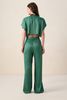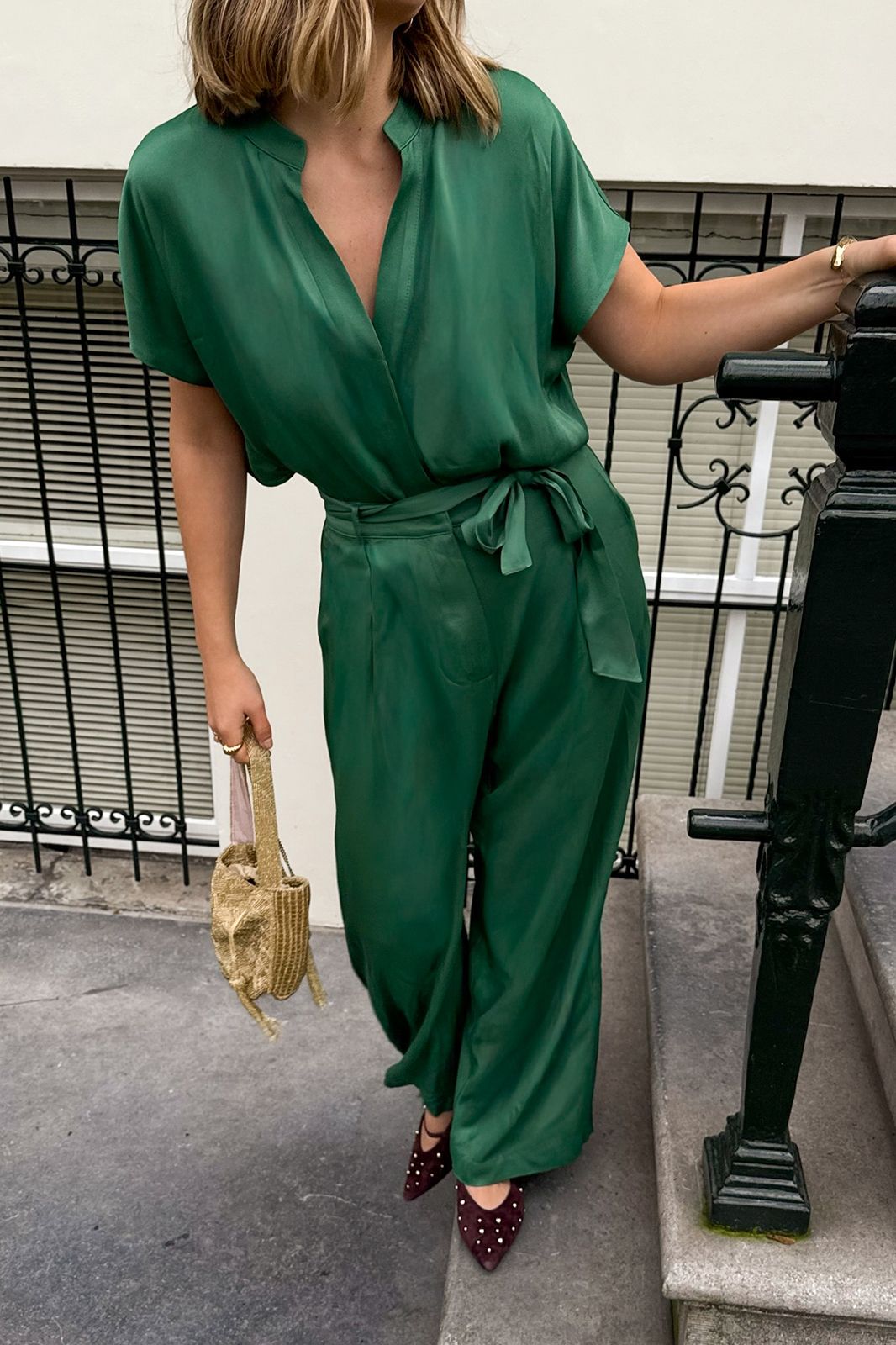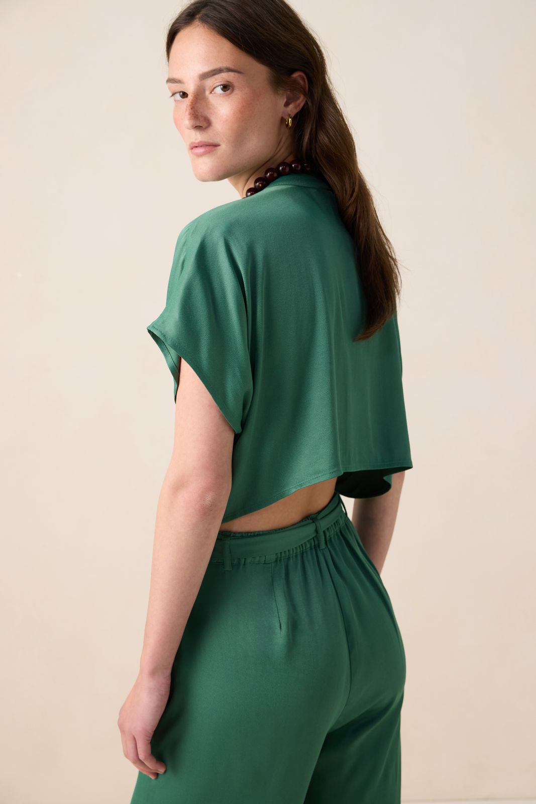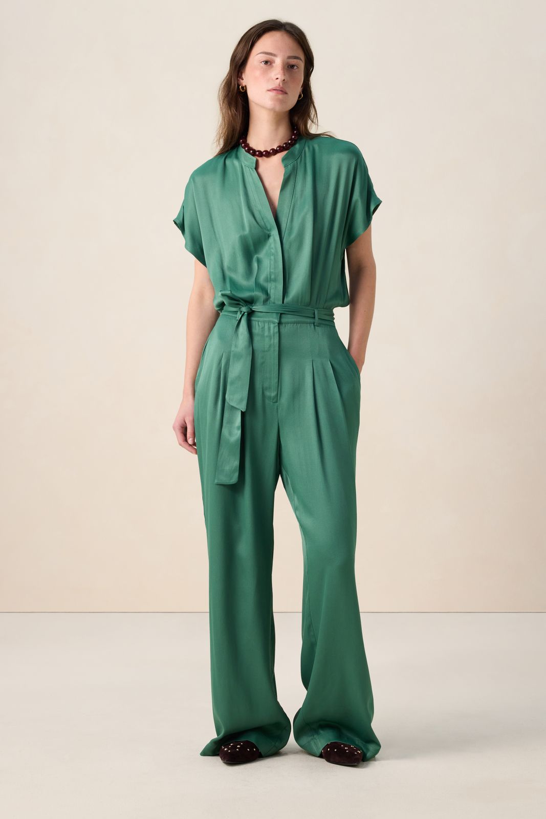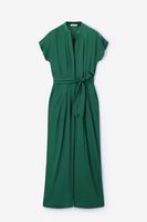Groene jumpsuit met open rug van Sissy-Boy. Deze satijnen jumpsuit met korte mouwen heeft een V-hals, een ceintuur in de taille en heeft een open rug detail. Het model heeft een lengte van 1,77 m en draagt maat S. Materiaal: 100% viscose.