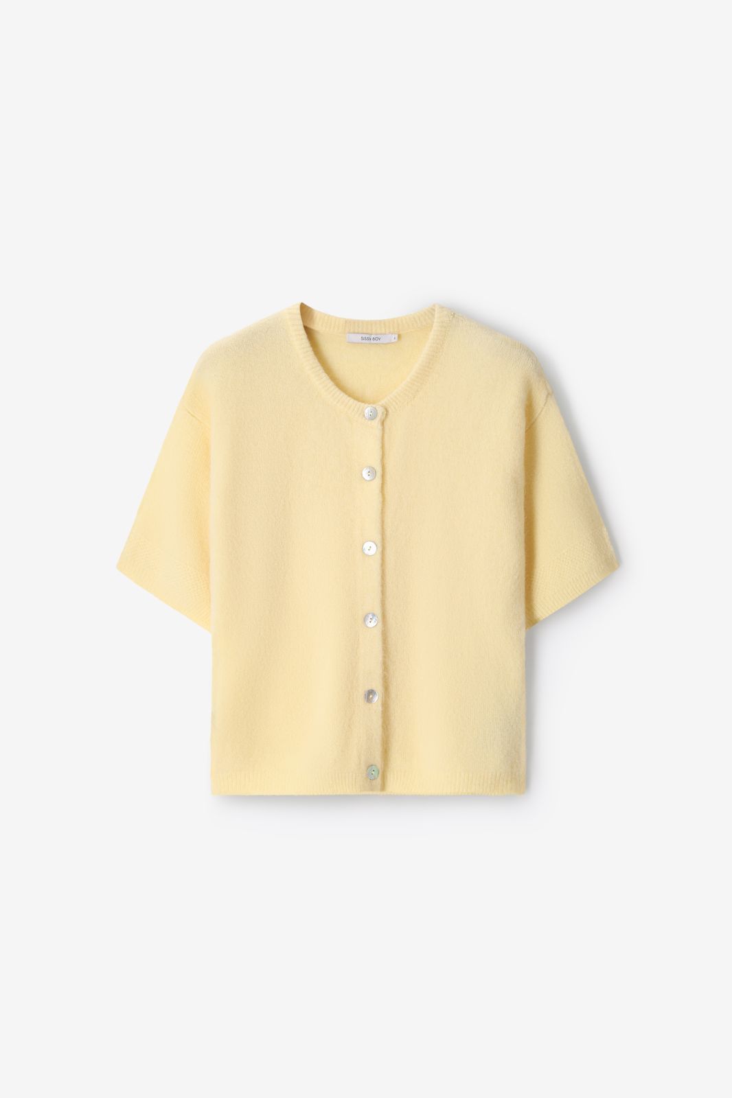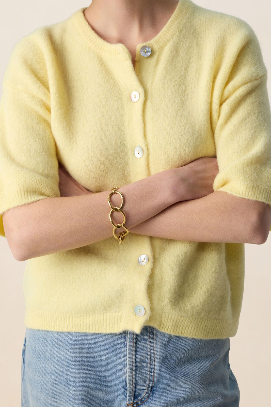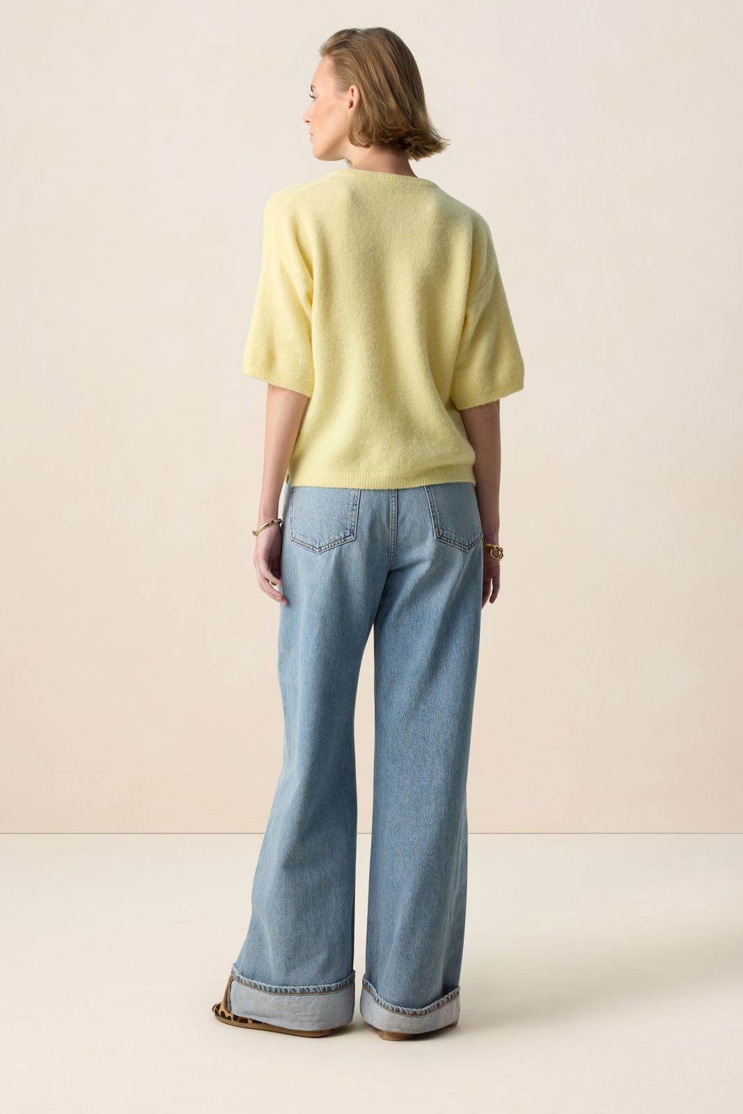 Lichtgeel gebreid vest van Sissy-Boy. Het vest heeft korte mouwen, een ronde hals, knoopsluitingen, een verlaagde hals, verlaagde schouders en een relaxed fit. Verder heeft het vest een lichtgele kleur en is gemaakt met een gebreide kwaliteit stof. Materiaal: 35% polyamide, 30% acryl, 16% alpaca, 16% wol, 3% elastaan.