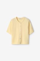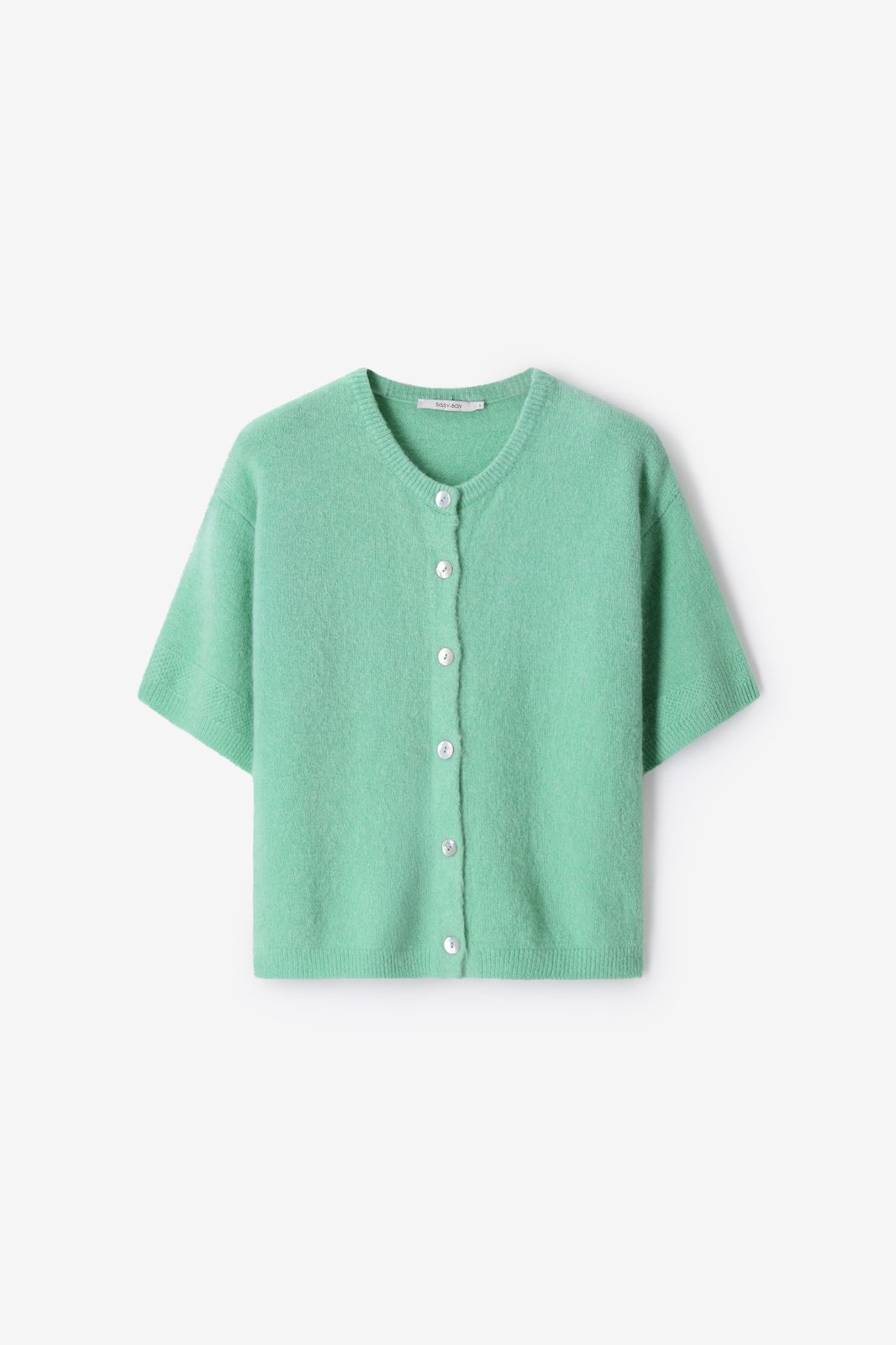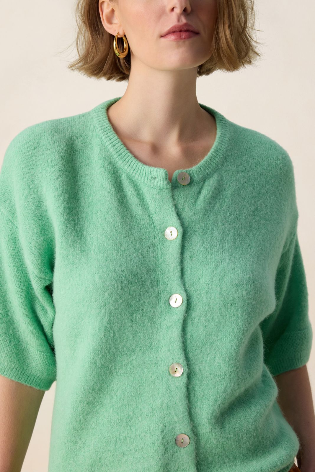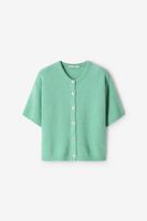 Lichtgroen gebreid vest van Sissy-Boy. Het vest heeft korte mouwen, een ronde hals, knoopsluitingen, een verlaagde hals, verlaagde schouders en een relaxed fit. Verder heeft het vest een lichtgroene kleur en is gemaakt met een gebreide kwaliteit stof. Het model heeft een lengte van 1.74 meter en draagt maat S. Materiaal: 35% polyamide, 30% acryl, 16% alpaca, 16% wol, 3% elastaan.