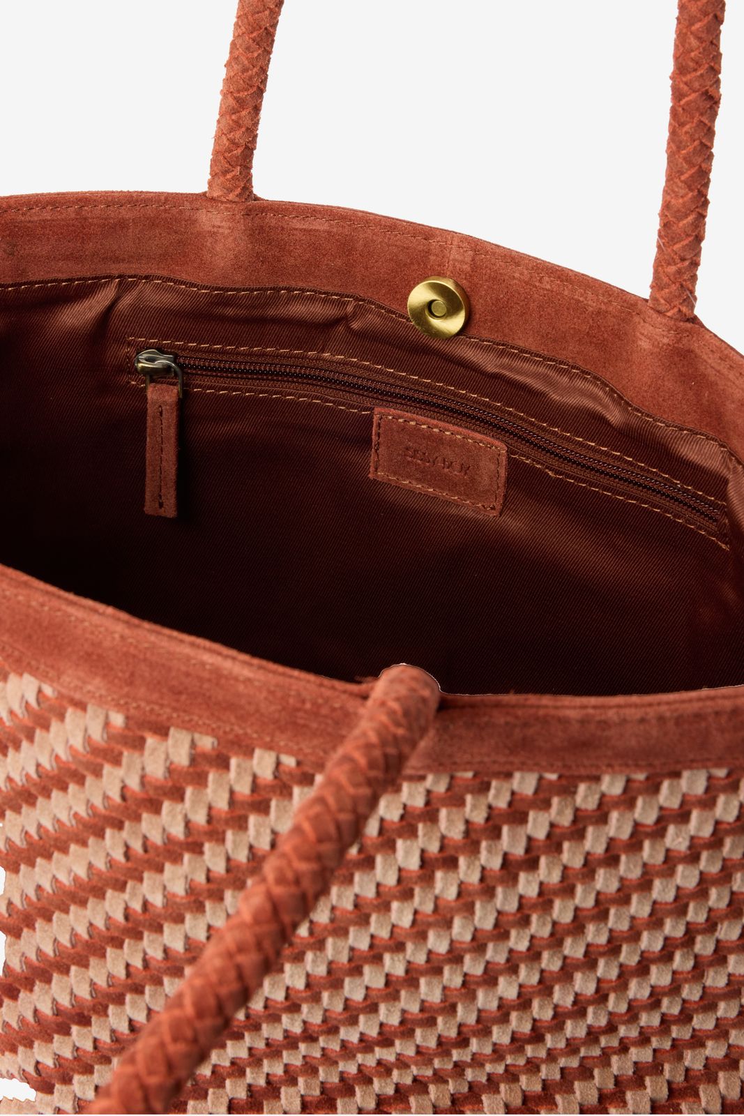 Lichtoranje gevlochten suède tas van Sissy-Boy. De tas heeft een lichtoranje kleur met een suède leer kwaliteit. Verder heeft de tas een binnenzak met een rits en gevlochten details in het leer. Materiaal: 100% leer.