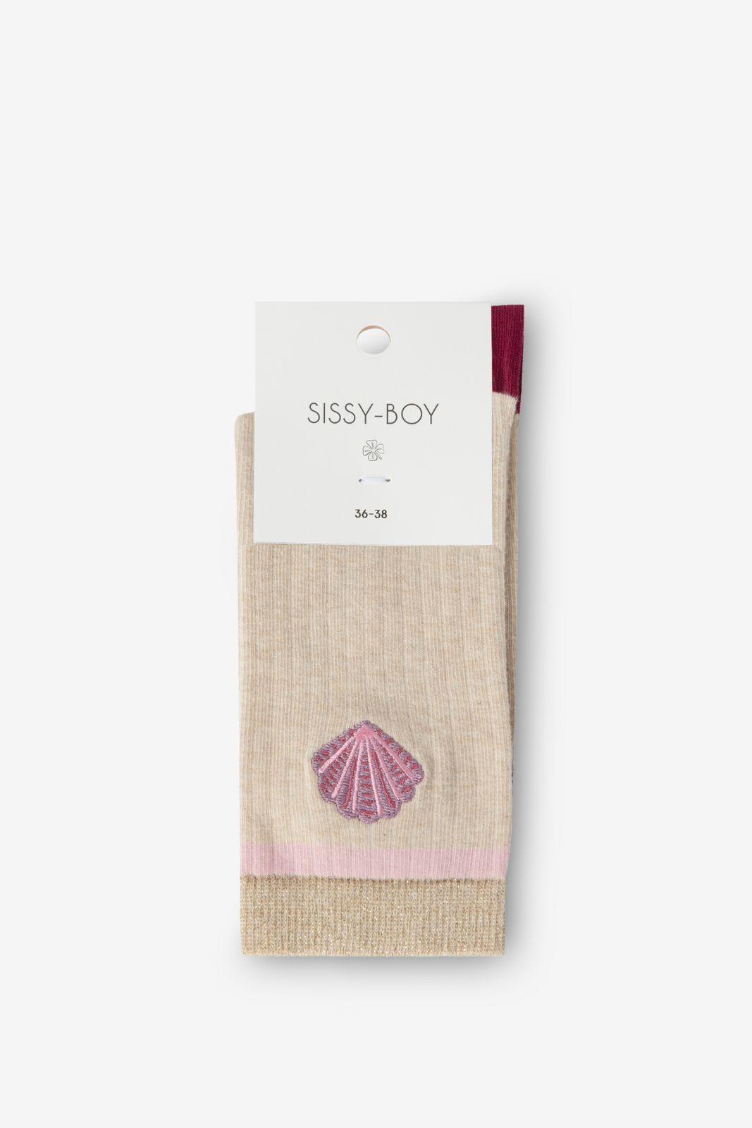 Lichtroze sokken met schelpen van Sissy-Boy. De beige sok heeft sportieve lichtroze streep en een paarse schelpen borduursel aan de bovenzijde. Materiaal: 72% katoen, 25% polyamide, 2% elastaan, 1% polyester.