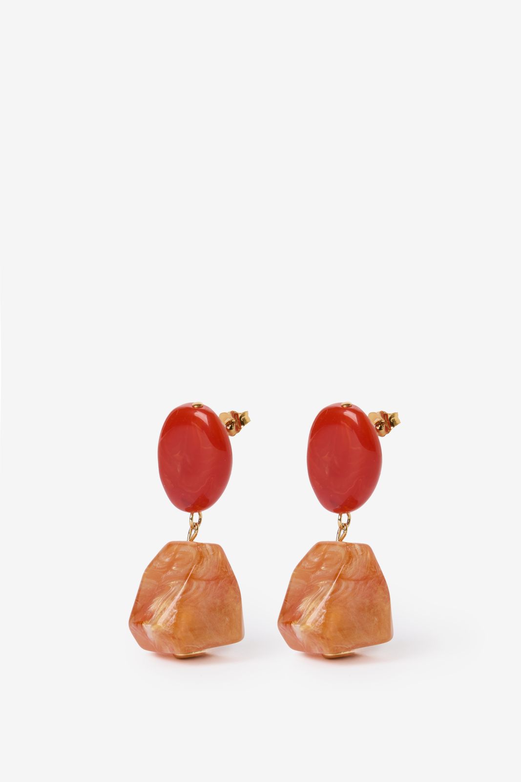 Oranje resin oorbellen van Sissy-Boy. De oorbellen hebben een rode knop met een oranje asymmetrische oranje hangers. Onderhoud sieraden Sissy-Boy: Vermijd contact met cosmetica (zoals parfum, haarlak, make-up, nagellakremover, lichaamsolie, zonnebrandolie, handgel en deodorant). Draag geen sieraden tijdens het douchen, baden of zwemmen. Met name chloor kan de sieraden permanent beschadigen of verkleuren. Afmetingen: 5 cm.