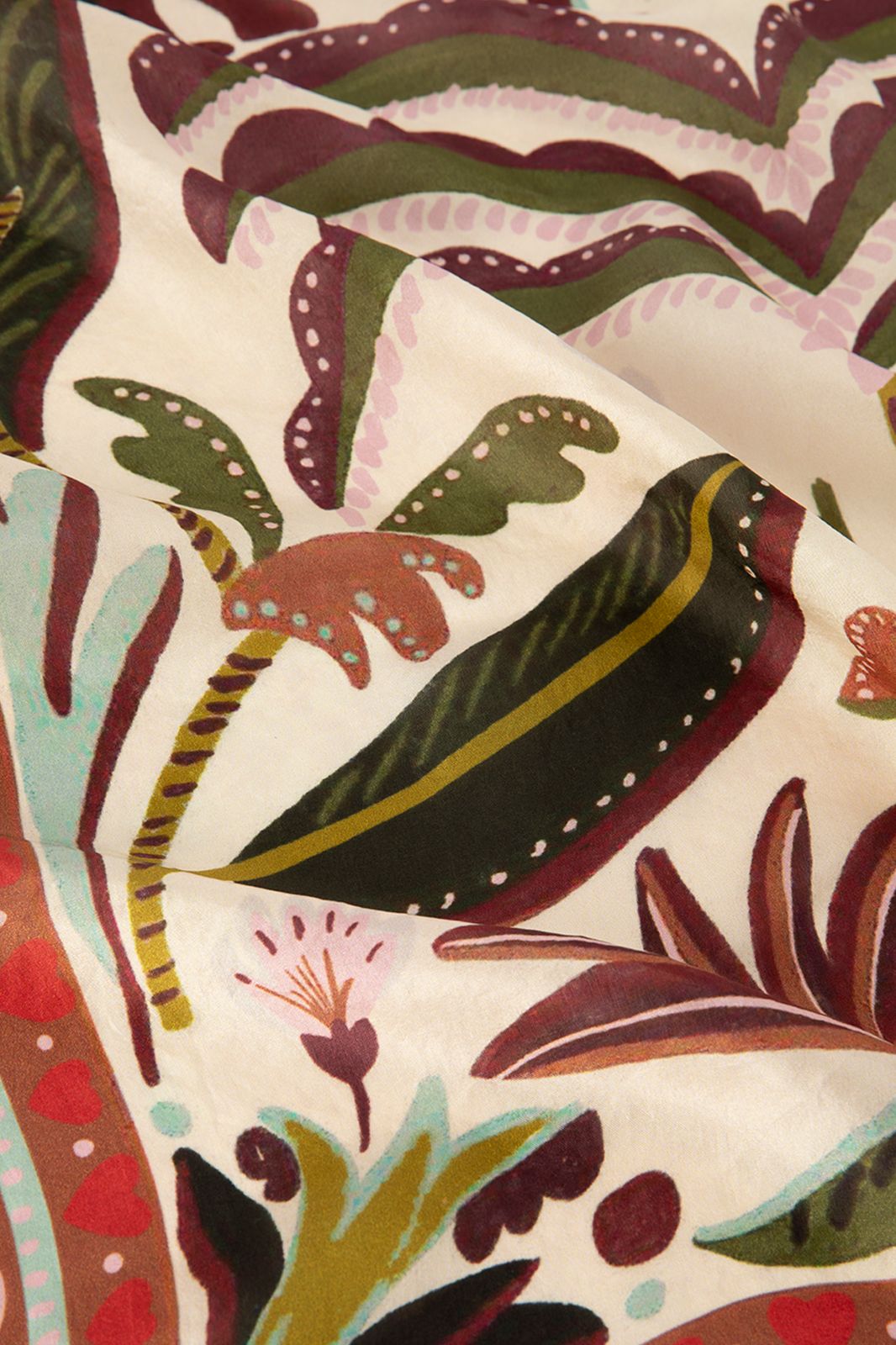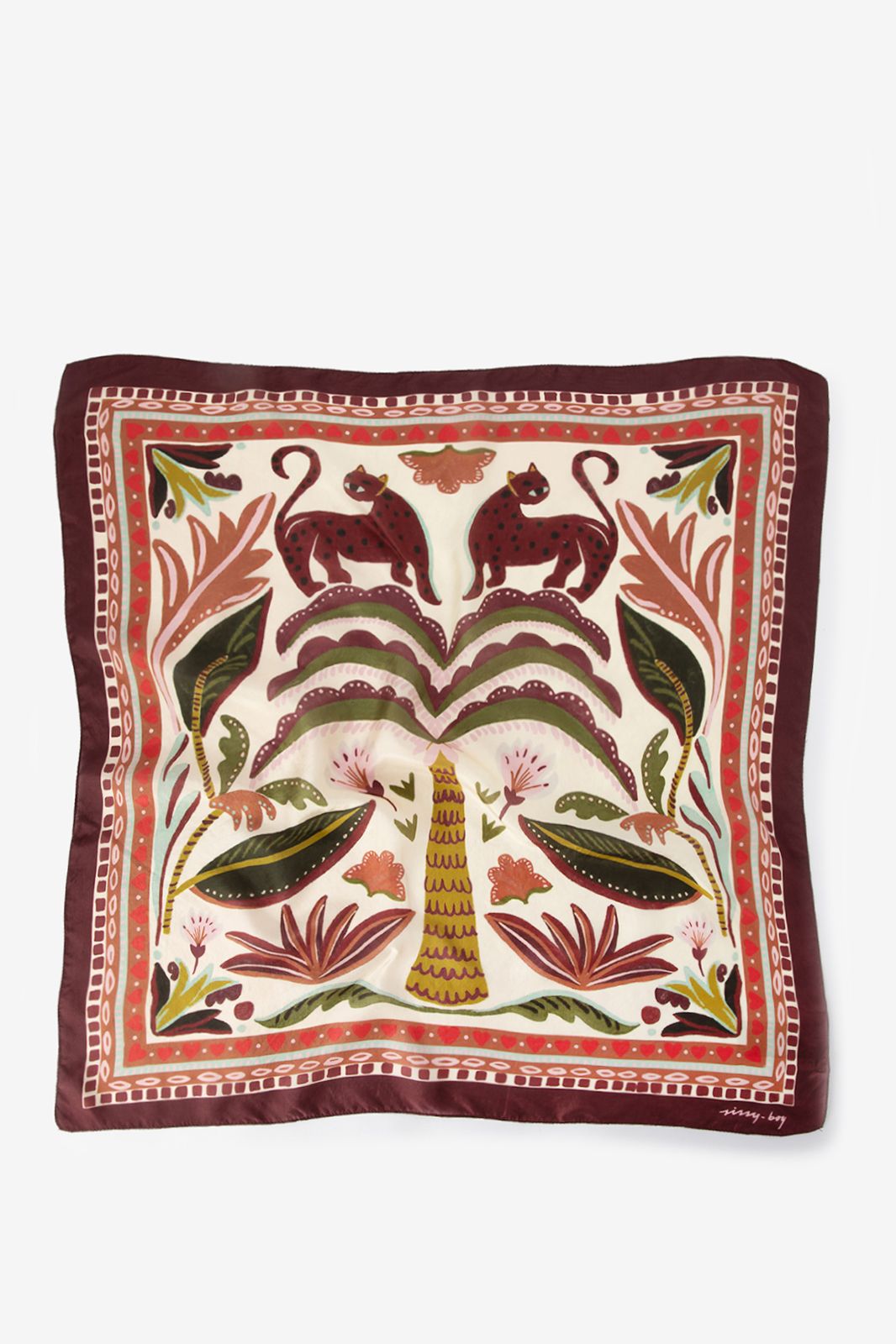Rode sjaal met panter van Sissy-Boy Deze sjaal heeft een glanzende look en is bedrukt met een all-over panter en palmbomenprint. Afmeting: 67 x 69 cm. Materiaal: 100% zijde.