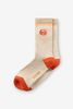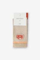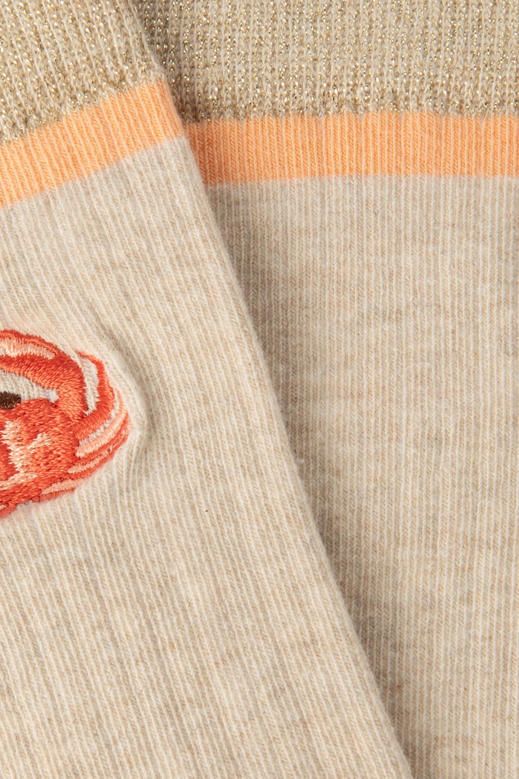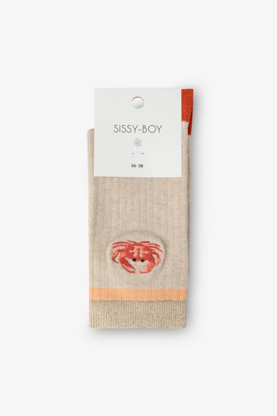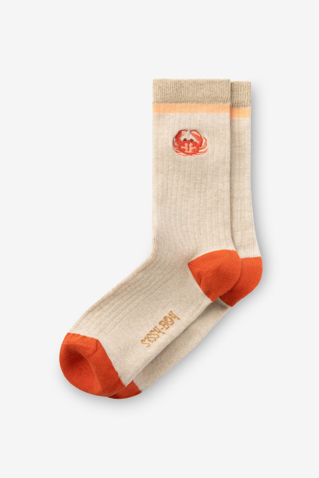 Rode sokken met krab van Sissy-Boy. De beige sok heeft sportieve oranje streep en een rode krab borduursel aan de bovenzijde. Materiaal: 72% katoen, 25% polyamide, 2% elastaan, 1% polyester.