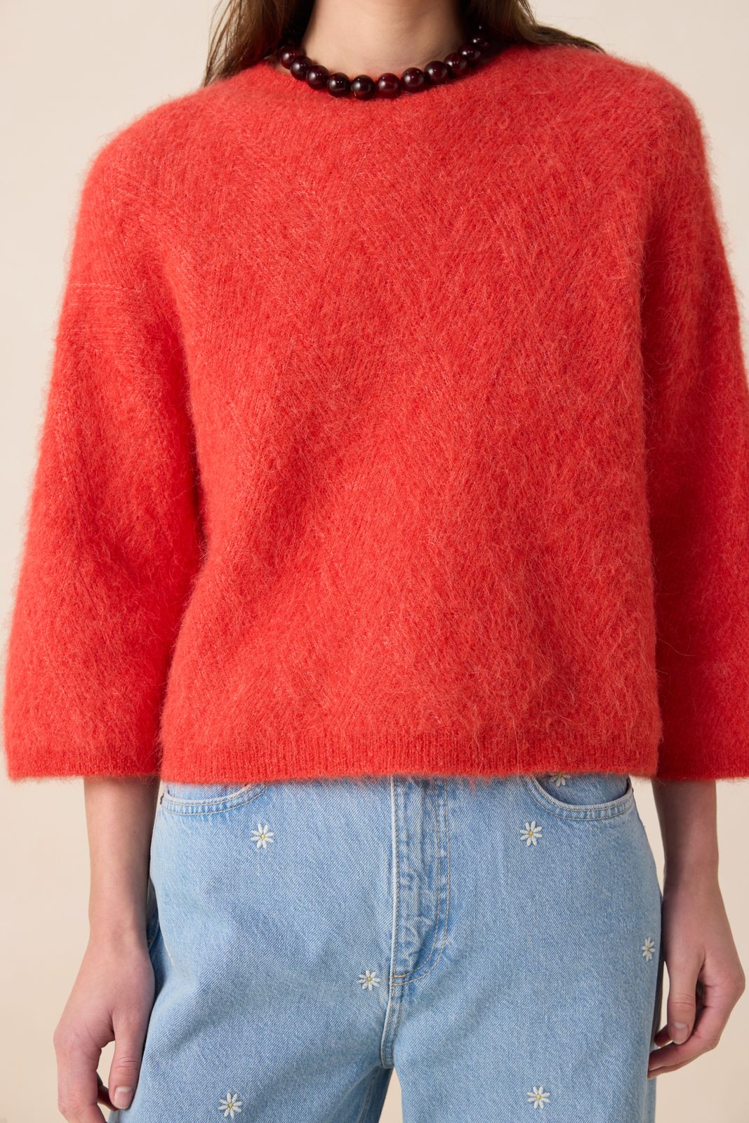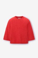 Rode trui met ruit patroon van Sissy-Boy. De trui heeft korte mouwen, een hoge ronde halslijn, een relaxed fit en ribboorden. Daarnaast heeft het een rode kleur met een all-over ruit patroon in de stof verwerkt. Het model heeft een lengte van 1,77 en draagt maat S. Materiaal: 71% alpaca, 27% polyamide, 2% elastaan.