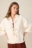 Wit jasje met striksluiting van Sissy-Boy. Het jasje heeft een aantrekkoord in de taille, een kraag, driekwart mouwen en sluit aan de voorkant met strikjes. Het model heeft een lengte van 1,72 m en draagt maat S. Materiaal: 61% katoen, 39% lyocell.