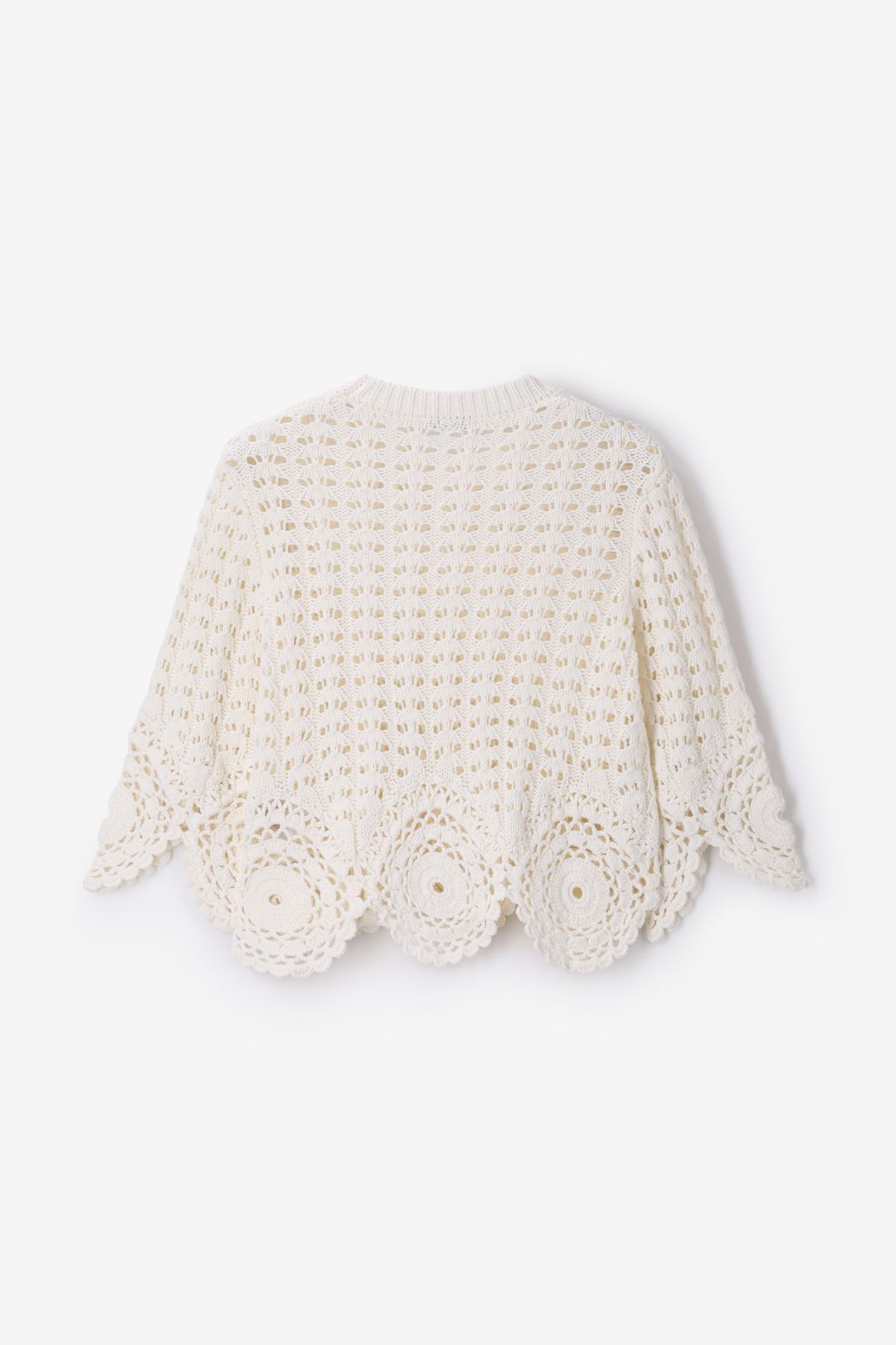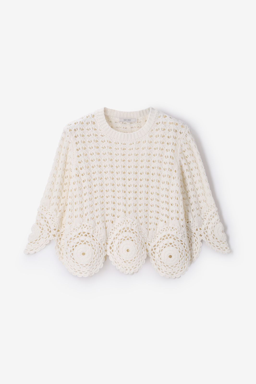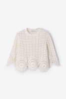 Witte opengewerkte trui van Sissy-Boy. De trui heeft korte mouwen en een ronde halslijn. Verder heeft de trui een witte kleur met opengewerkte gebreid design en ronde crochet details aan de onderzijde van de trui en mouwen. Materiaal: 100% katoen.