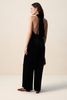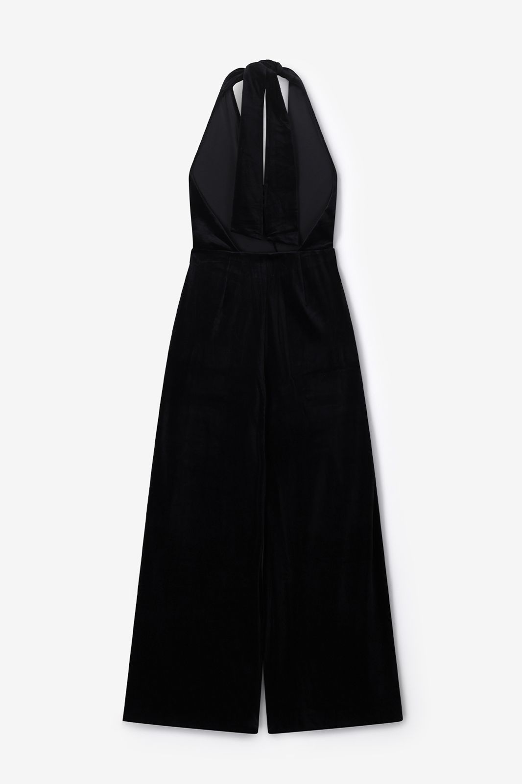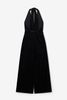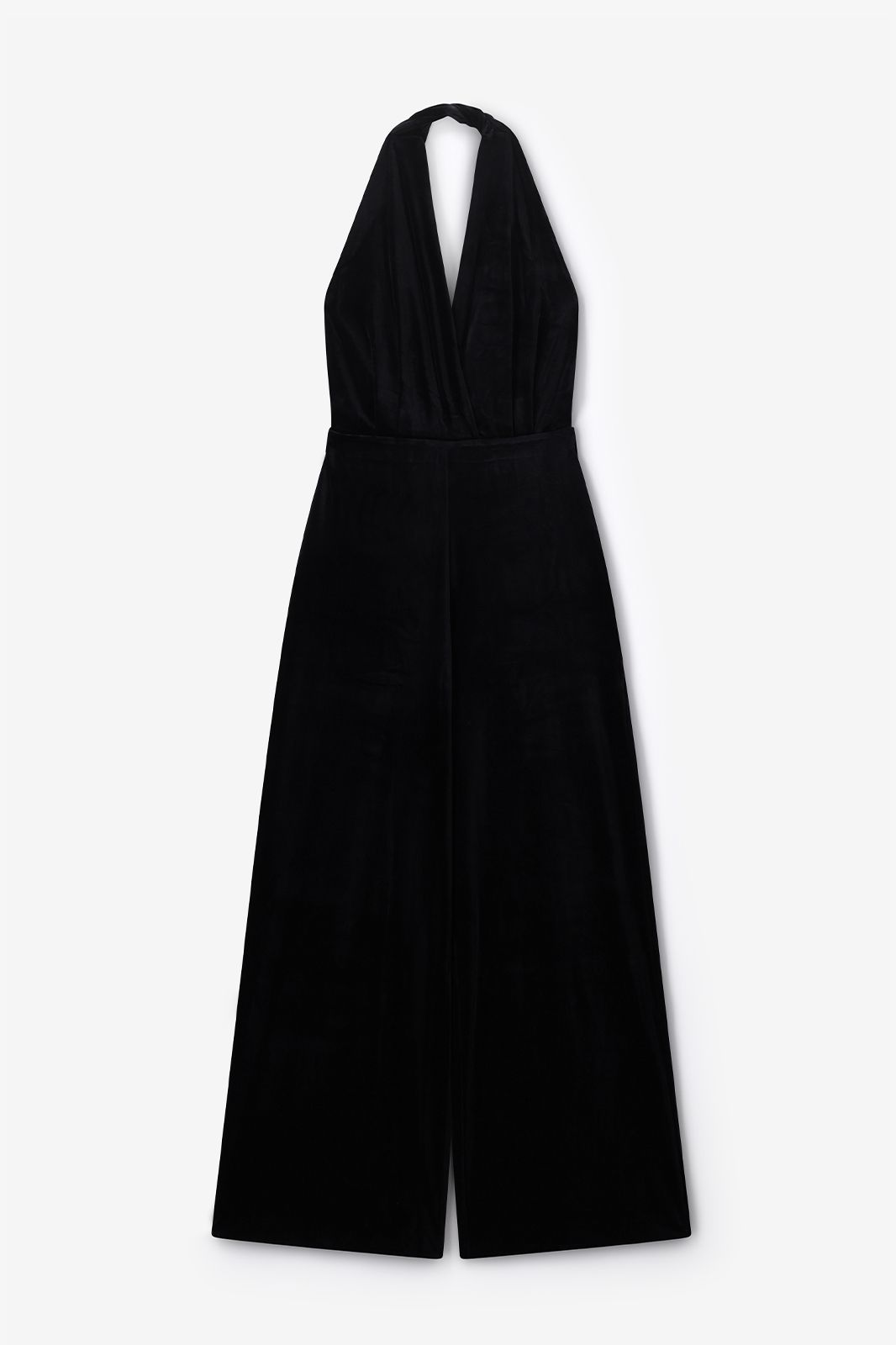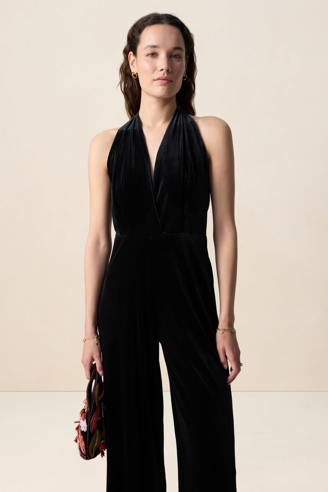 Zwarte halter jumpsuit van Sissy-Boy. De jumpsuit heeft een halter model, striksluiting in de hals, ceintuur in de taille en wijde broekspijpen. Verder is de jumpsuit gemaakt van een zwarte velvet kwaliteit stof. Het model heeft een lengte van 1,74 m en draagt maat S. Materiaal: 100% polyester.