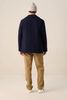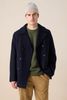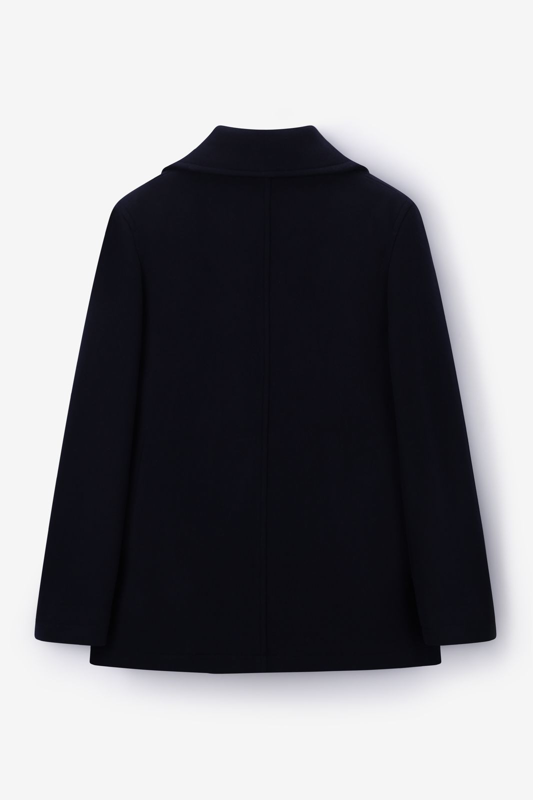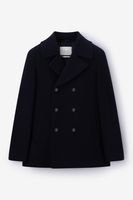 Donkerblauwe wollen peacoat jas van Sissy-Boy. De halflange jas heeft lange mouwen, een reverse kraag, knoopsluiting en steekzakken. De jas is uitgevoerd in een donkerblauwe kleur met een klassiek peacoat model. Het model heeft een lengte van 1,87 m en draagt maat M. Materiaal: 70% wol, 30% polyamide.