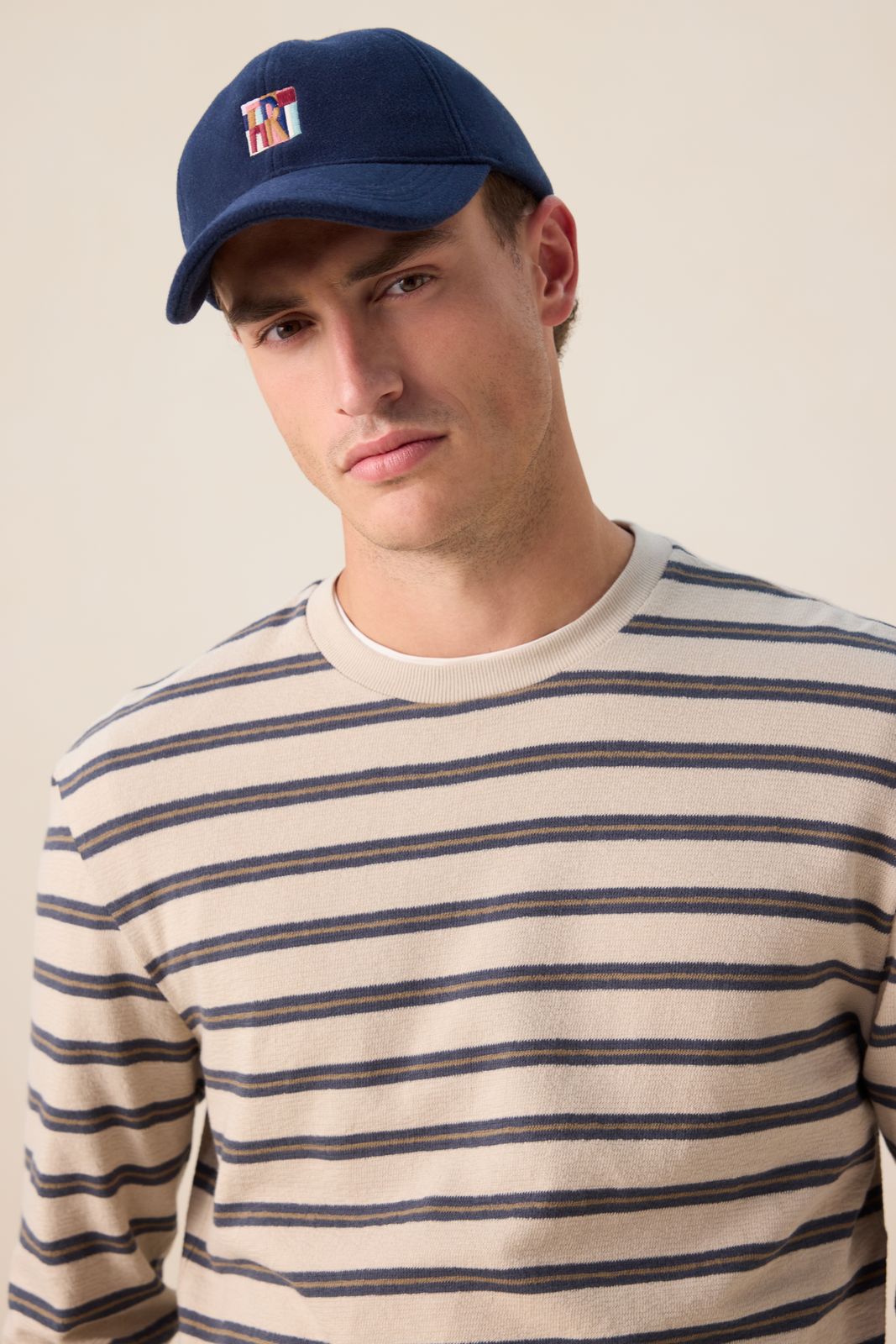 Donkerblauwe wollen pet met artwork van Sissy-Boy. De pet heeft een donkerblauwe kleur en een kleurrijk grafisch artwork aan de voorzijde. Materiaal: 60% wol, 40% polyester.