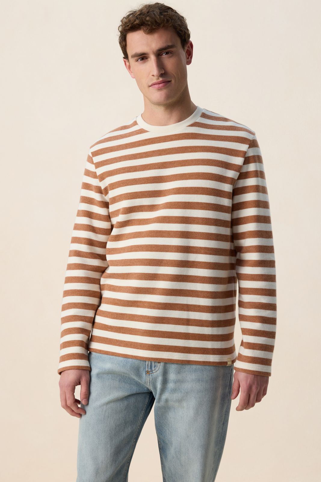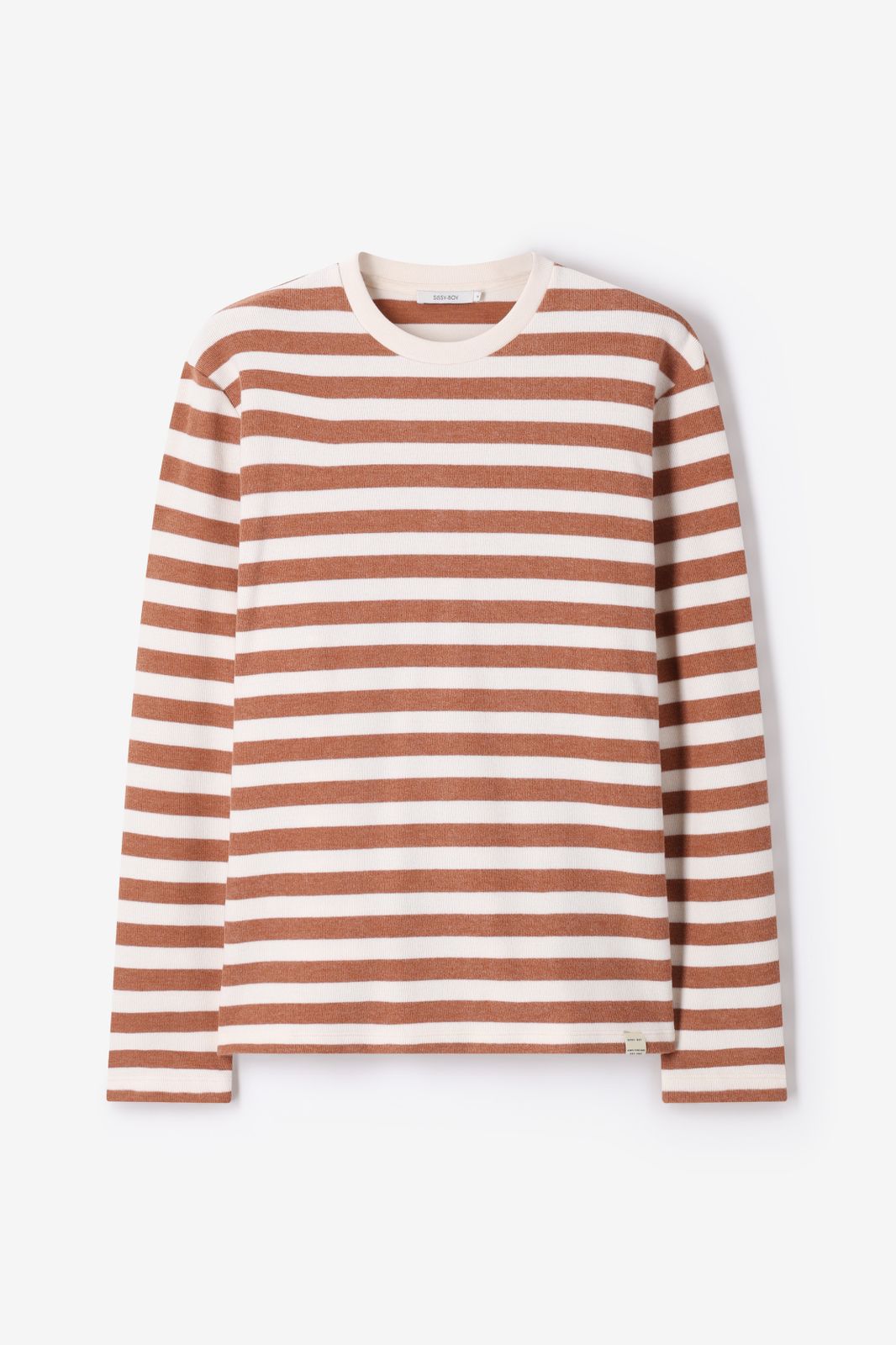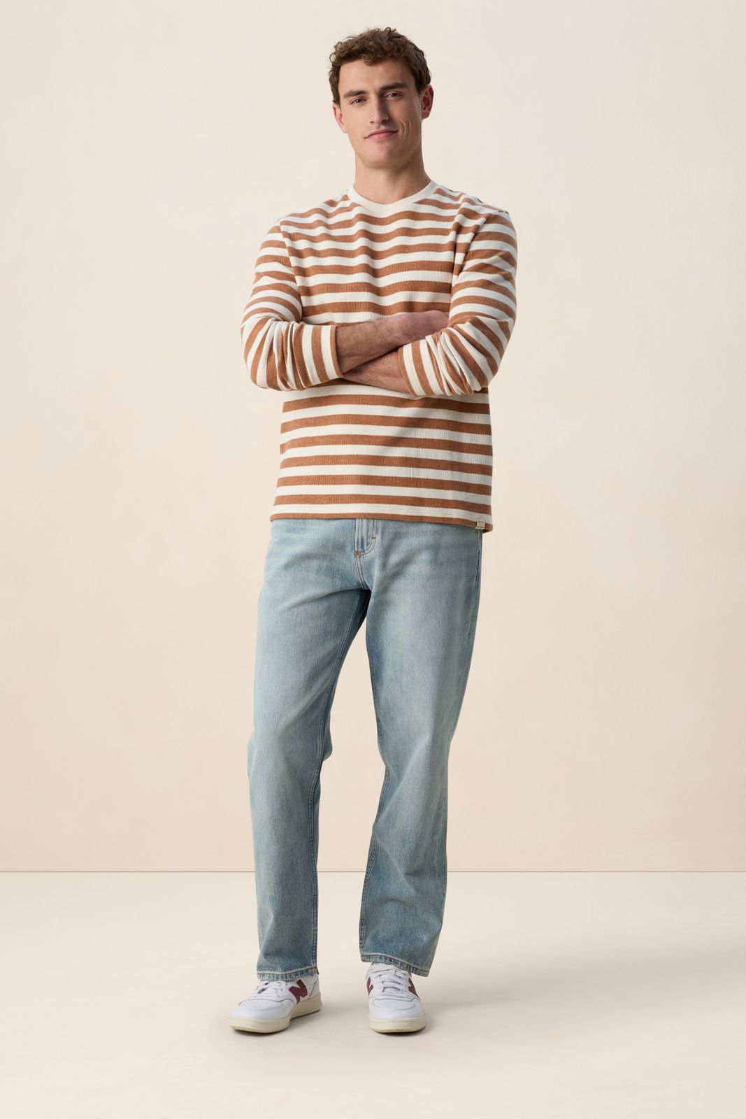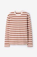 Donkerbruine gestreepte sweater van Sissy-Boy. De sweater heeft lange mouwen, een ronde hals, verlaagde schouders en een regular fit. De sweater heeft een gestreept patroon met bruine en witte strepen. Materiaal: 50% katoen, 50% polyester.