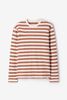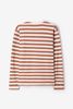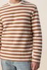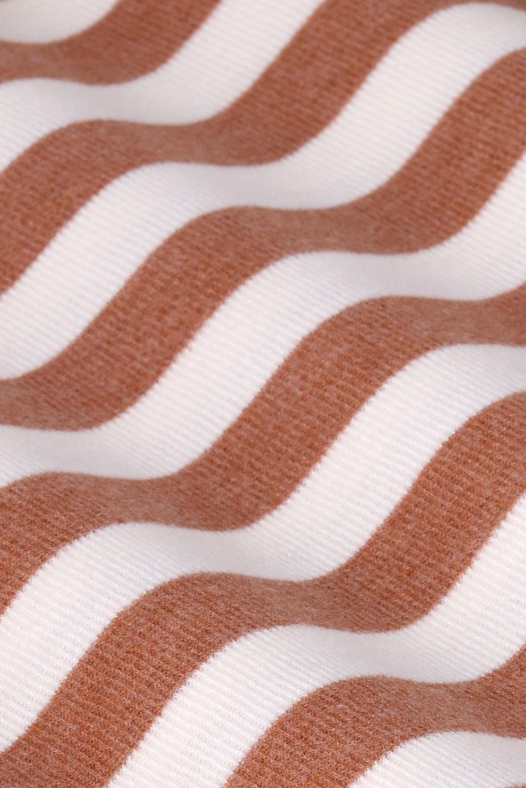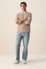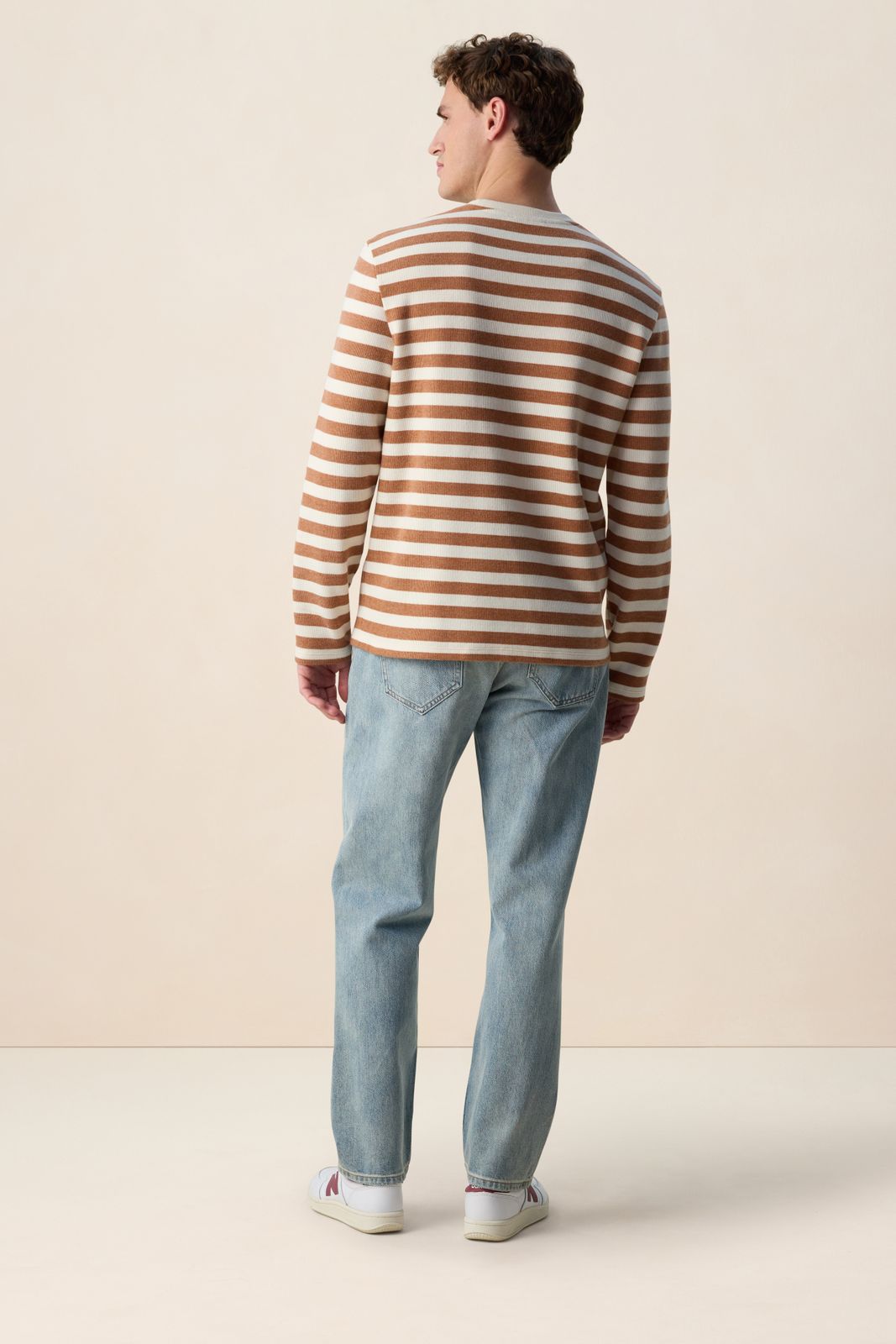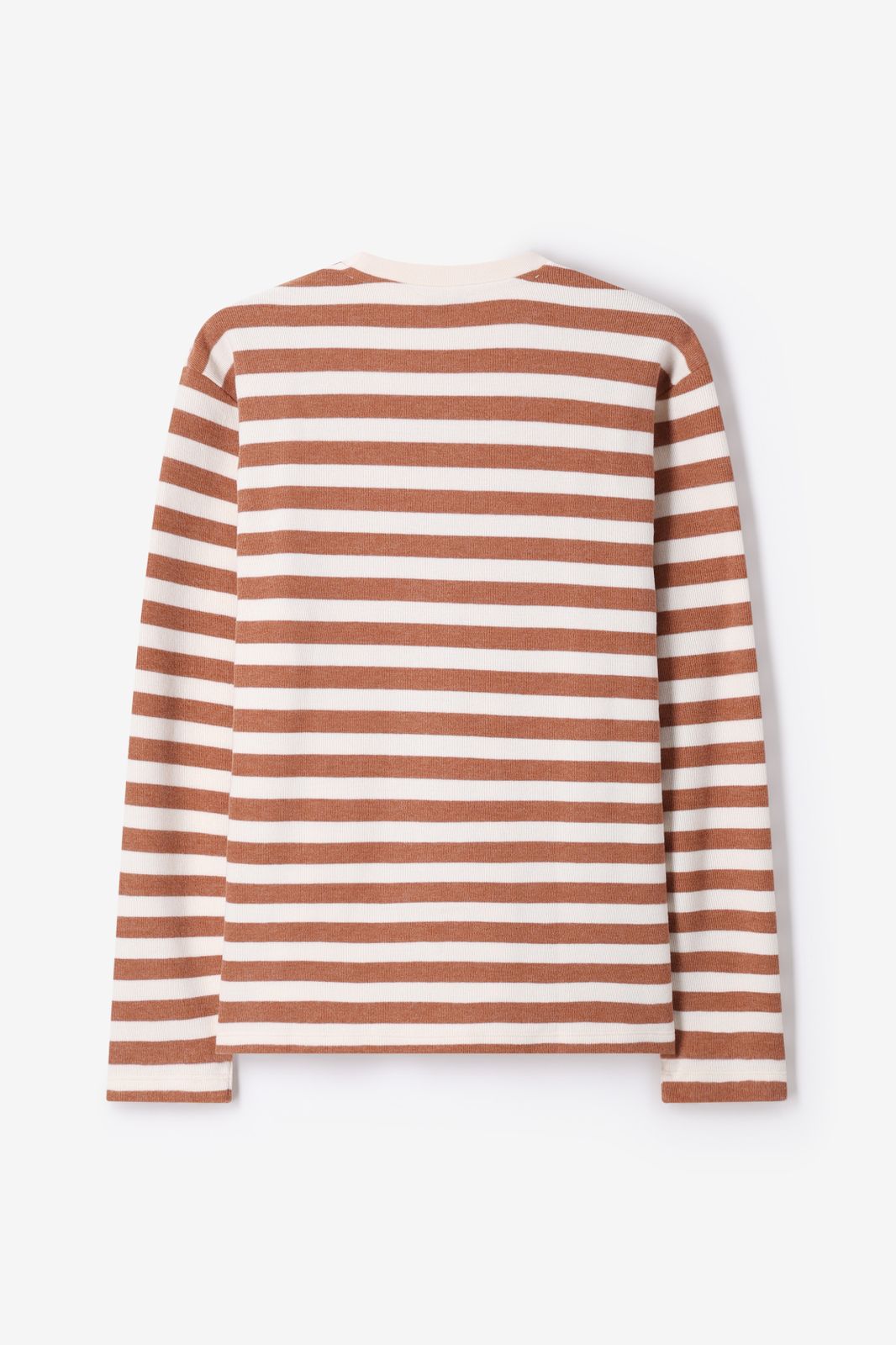 Donkerbruine gestreepte sweater van Sissy-Boy. De sweater heeft lange mouwen, een ronde hals, verlaagde schouders en een regular fit. De sweater heeft een gestreept patroon met bruine en witte strepen. Materiaal: 50% katoen, 50% polyester.