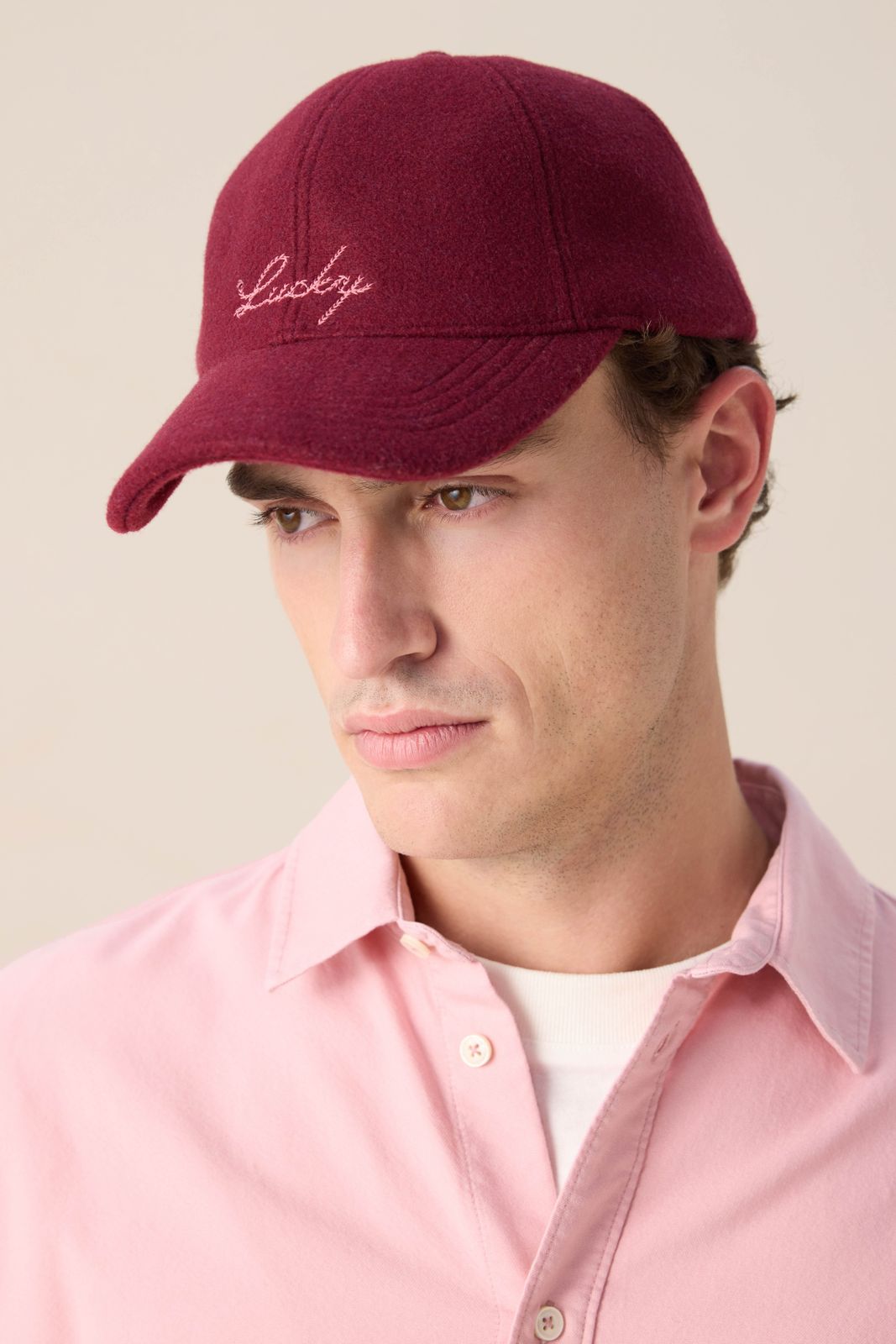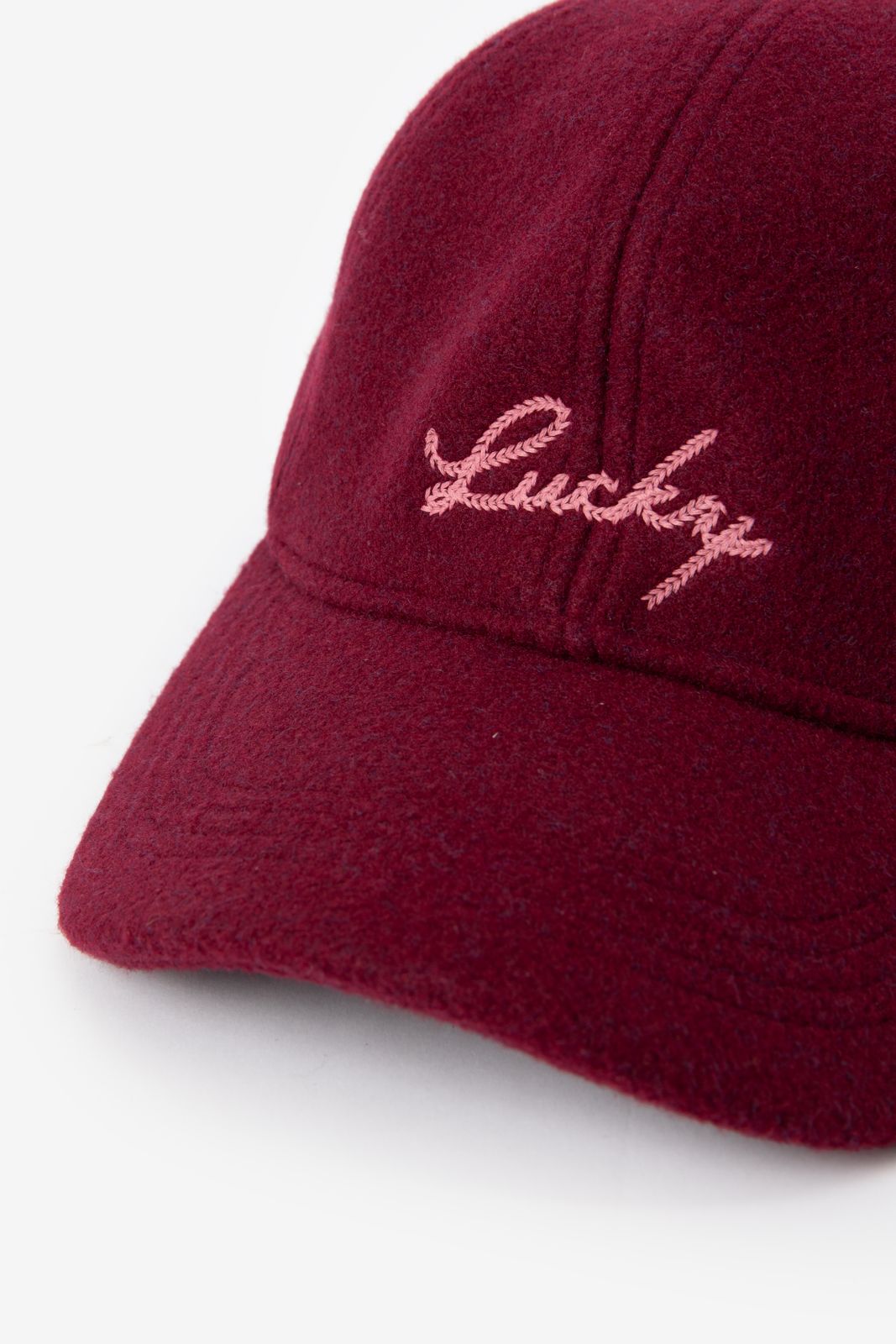 Donkerrode wollen pet met tekst van Sissy-Boy. De pet heeft een rode kleur en heeft het woord "Lucky" in het roze opgestikt aan de voorzijde. Materiaal: 60% wol, 40% polyester.