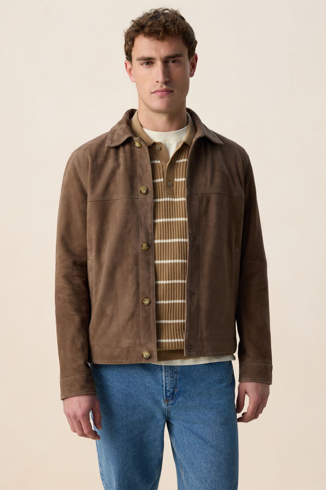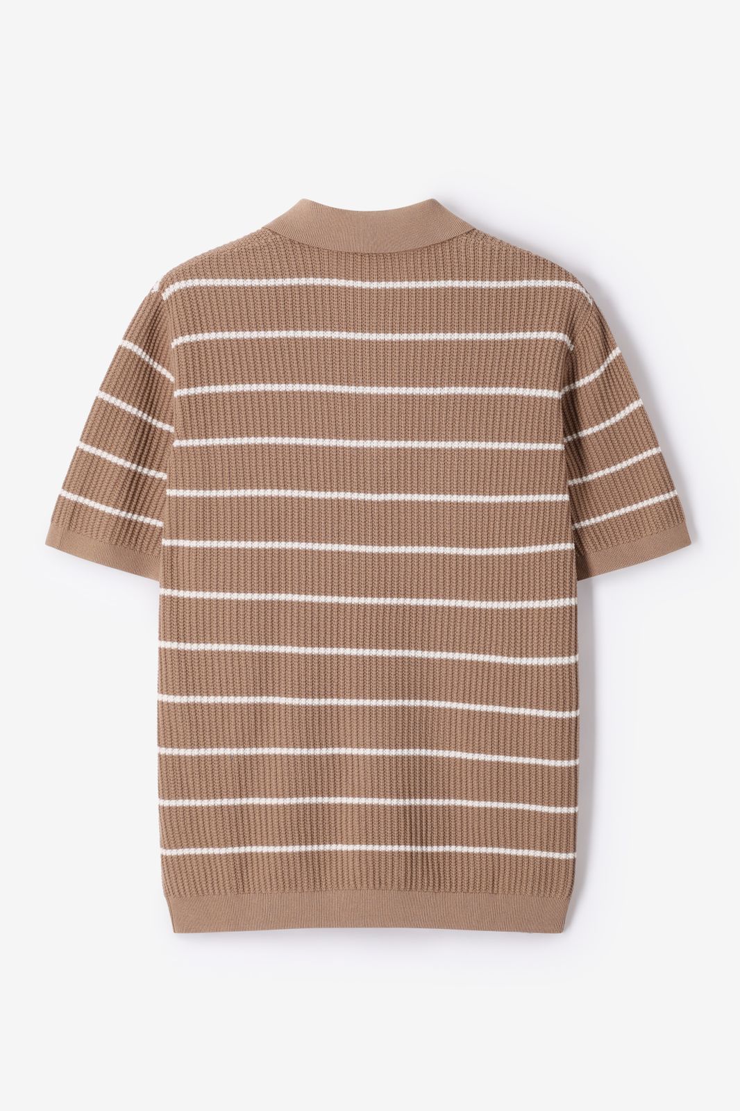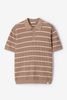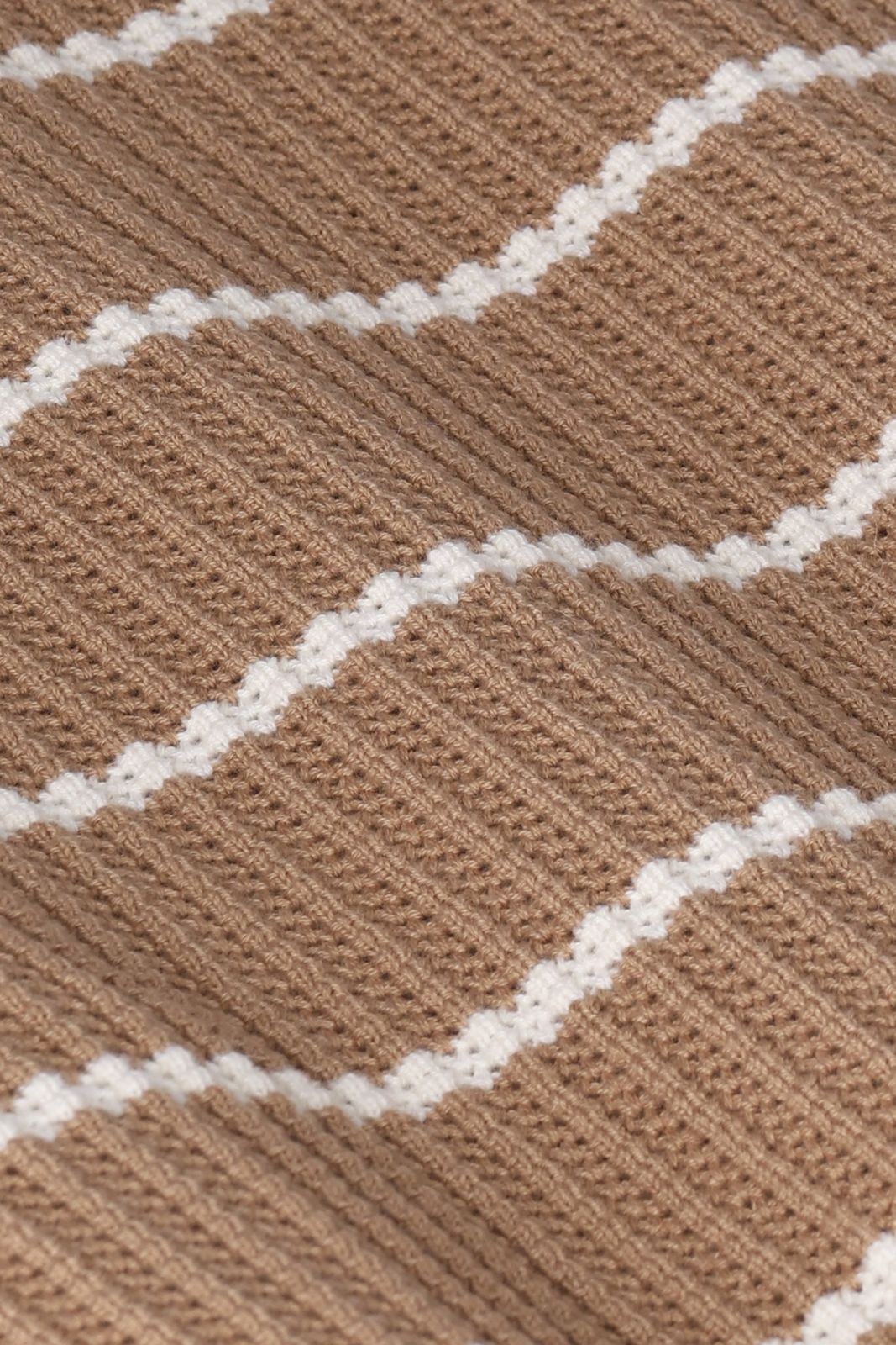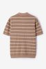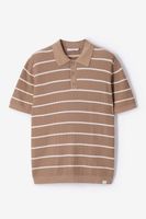Lichtbruine polo met strepen van Sissy-Boy. De polo heeft korte mouwen, een hoge hals, kraag en een knoopsluiting. Daarnaast heeft het een lichtbruine kleur met een all-over horizontale strepen design in het wit. Materiaal: 100% katoen.