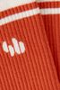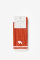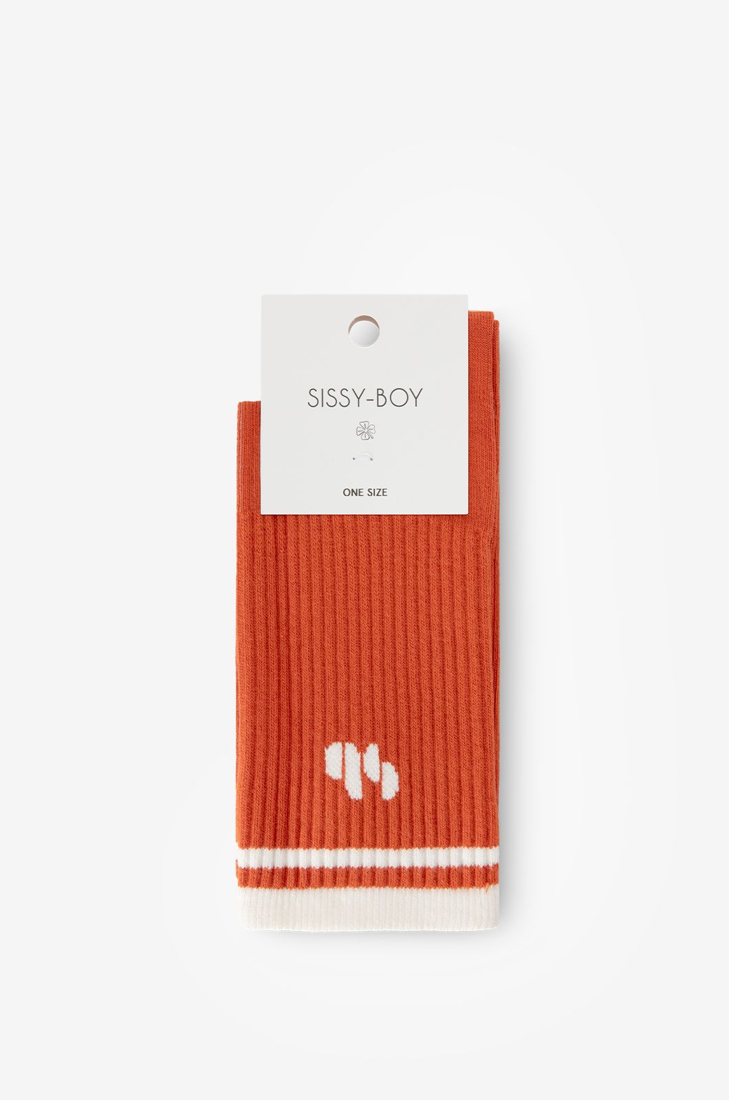 Rode sokken met logo van Sissy-Boy. De sokken hebben een ribkwaliteit in de stof, een wit Sissy-Boy logo en twee witte strepen aan de bovenzijde van de sokken. Materiaal: 79% katoen, 19% polyester, 2% elastaan.