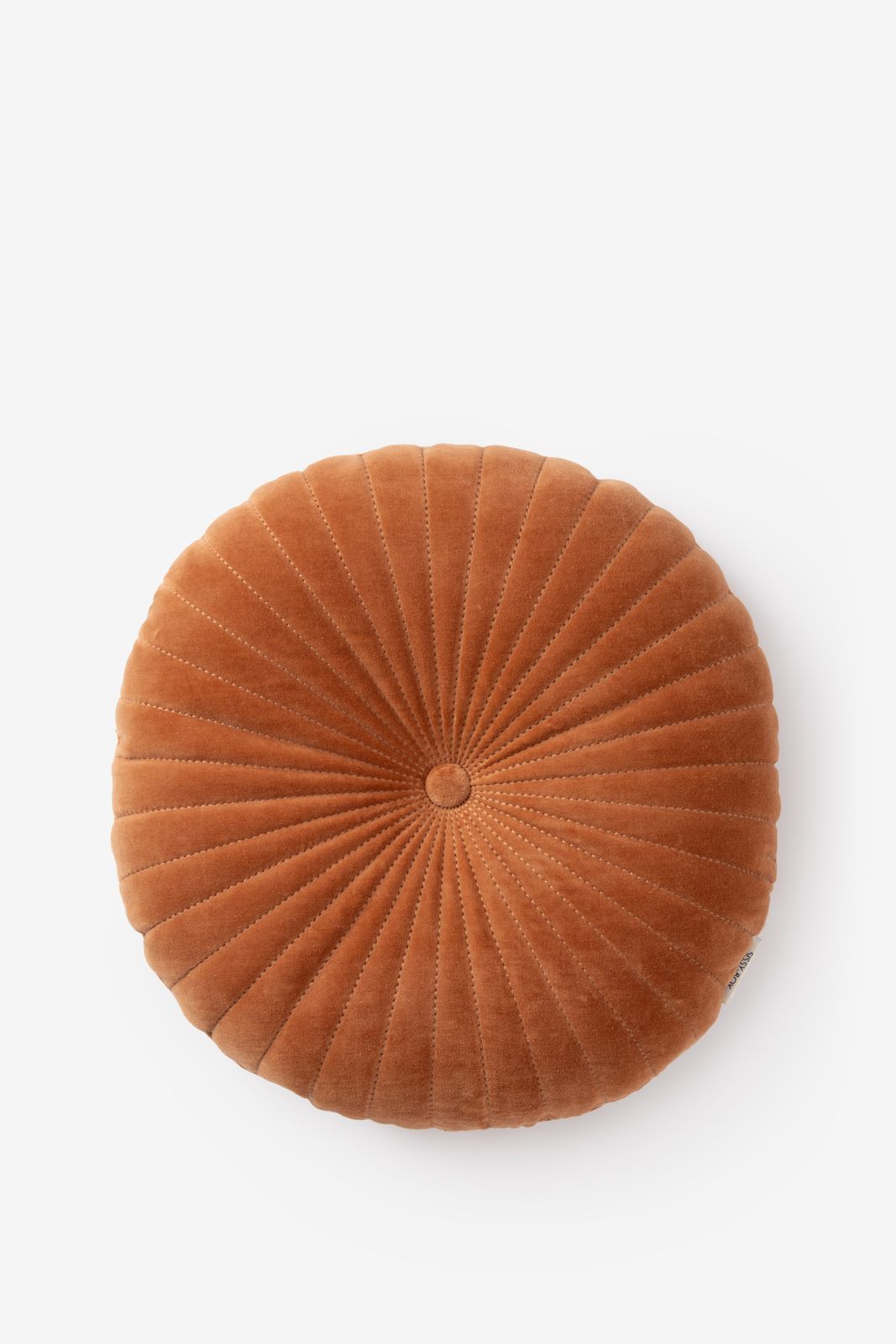 Bruin rond velvet kussen van Sissy-Boy. Het kussen heeft een bruine kleur en een knoop detail in het midden. Verder is het kussen gemaakt met een velvet kwaliteit stof. Afmeting: 40 cm. Materiaal: 100% katoen.