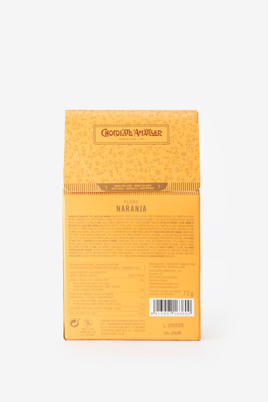 Chocolate Amatller bonbons van melk chocolade met een sinaasappel vulling. Ingrediënten: cacaomassa, suiker, natuurlijk sinaasappelsap (15 %), cacaoboter, sinaasappelconfituur (8 %) (sinaasappelschil, gluco- en fructosestroop, suiker, zuurteregelaar E330), magere cacaopoeder, vloeibare glucose, emulgator (sojalecithine), water, aroma’s, conserveermiddel (E202). LET OP: kan sporen van noten en melk bevatten. Inhoud: 72 gr.