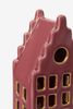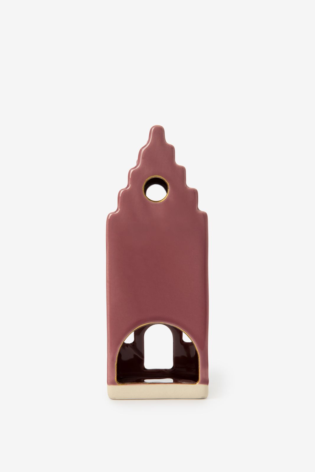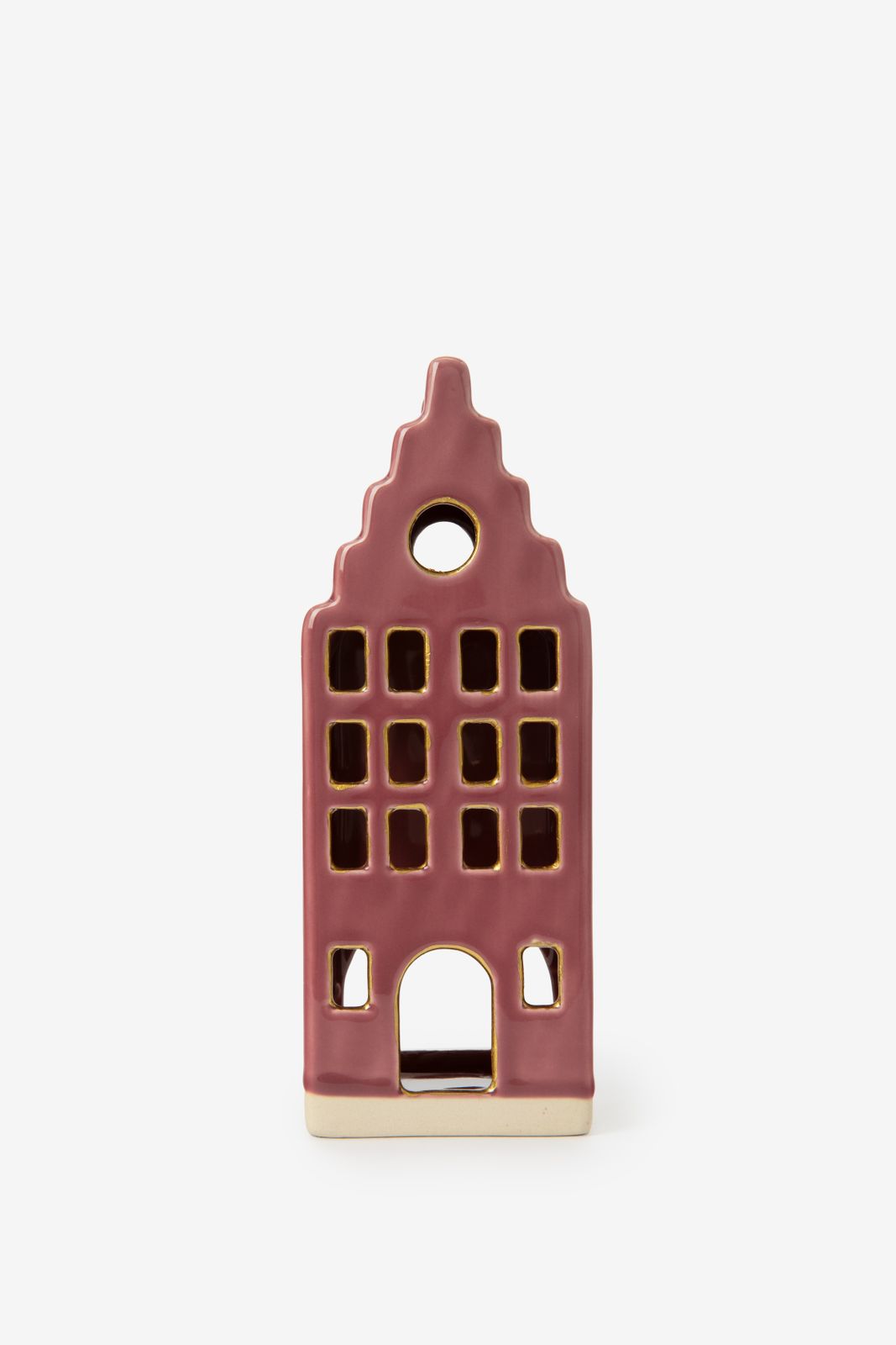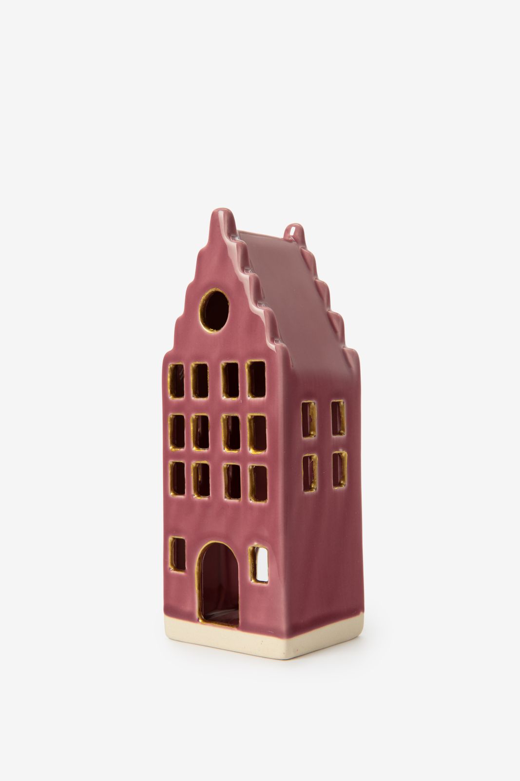 Donkerpaarse waxinelichthouder met trapgevel van Sissy-Boy. Zet er via de achterkant een waxinelichtje in en warm licht schijnt via de raampjes naar buiten! Ook leuk te combineren met de andere huisjes uit de collectie voor een klein dorpje. Afmeting: 17 cm. Materiaal: 100% keramiek.