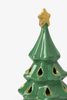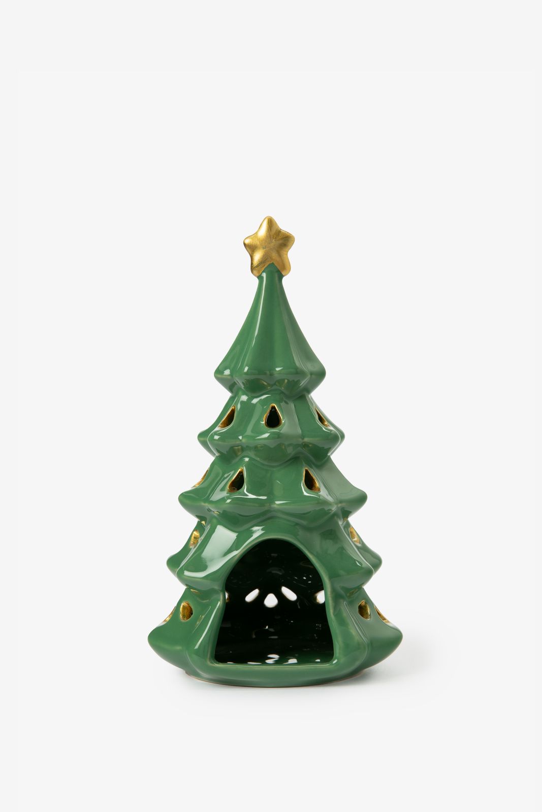 Groene kerstboom waxinelichthouder van Sissy-Boy. De waxinelichthouder heeft een groene kleur, de vorm van een kerstboom en een gouden ster bovenop. Afmeting: 20,5 cm. Materiaal: 100% keramiek