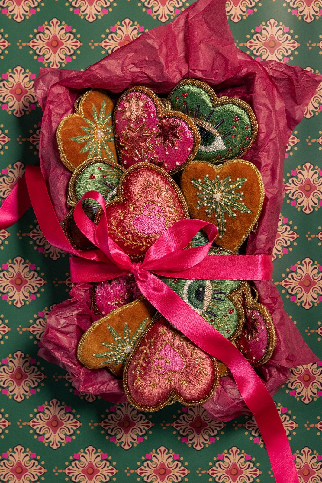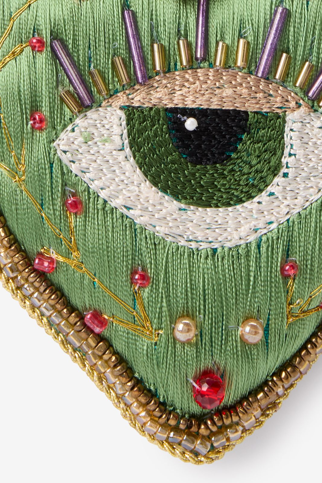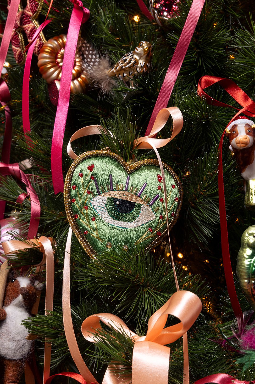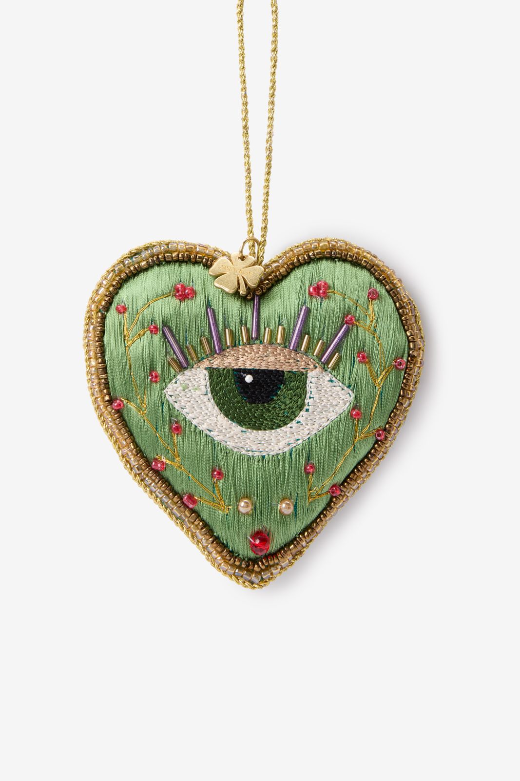 Groene kersthanger met oog van Sissy-Boy. De hanger heeft een groene kleur en is in de vorm van een hart. Verder heeft de hanger een oog in het midden en is het versierd met gekleurde kralen. Afmeting: 10 cm. Materiaal: 70% glas, 30% polyester