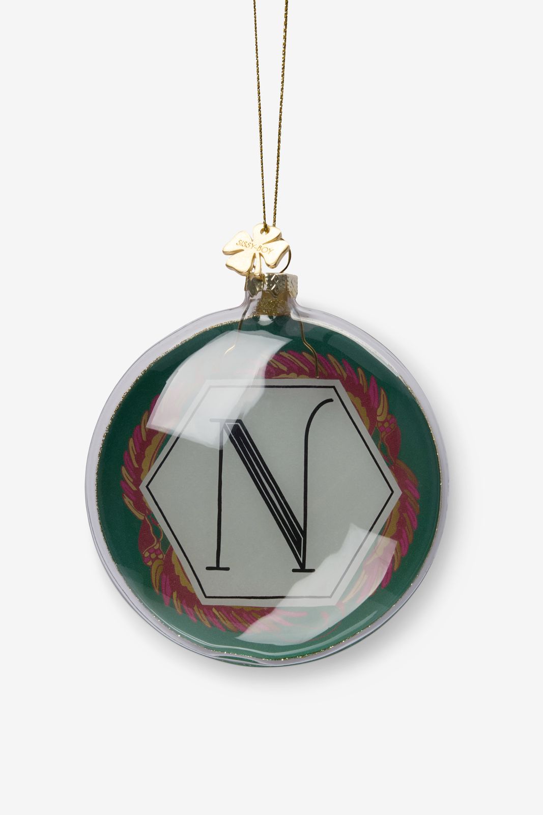 Kerstbal met de letter N van Sissy-Boy. De voorkant heeft een uniek ontwerp met een initiaal, de achterkant straalt met gouden glitters en is super leuk voor in je kerstboom. Materiaal: 100% glas