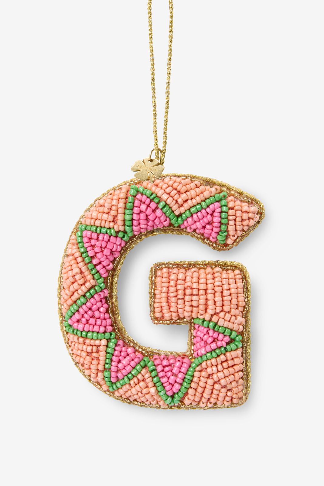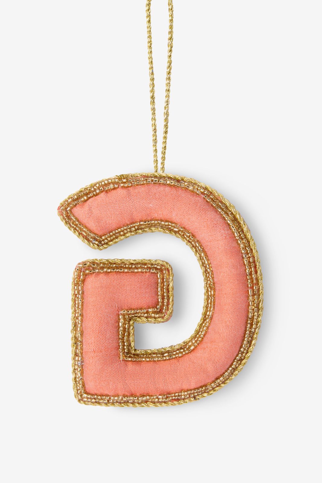 Lichtroze kersthanger van Sissy-Boy in de vorm van het initiaal G. De letter kersthanger is versierd met glazen kraaltjes op de voorkant en afgewerkt met een satijn look aan de achterkant. Materiaal: 100% polyester.