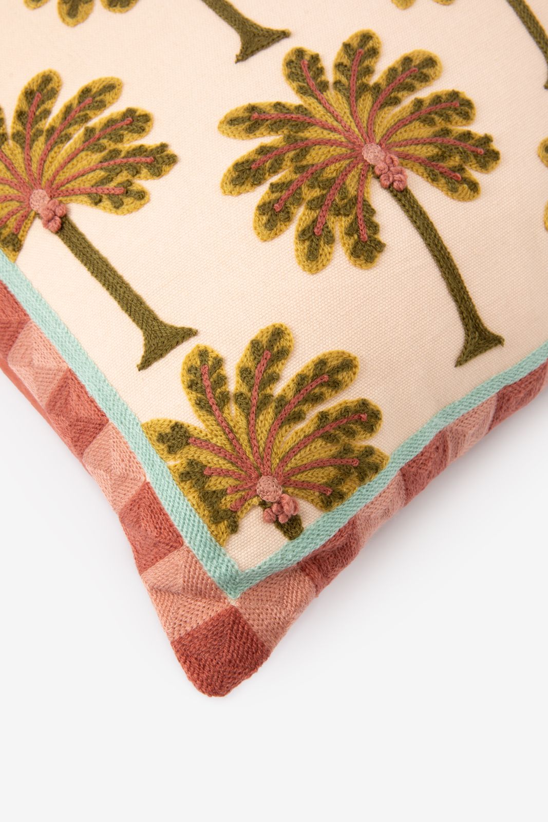 Multicolour kussen met palmbomen van Sissy-Boy. Het kussen heeft een lichtroze kleur met all-over geborduurde palmbomen. Afmetingen: 40 cm x 60 cm. Materiaal: 100% katoen. Vulling: 100% polyester,